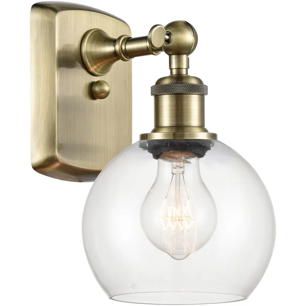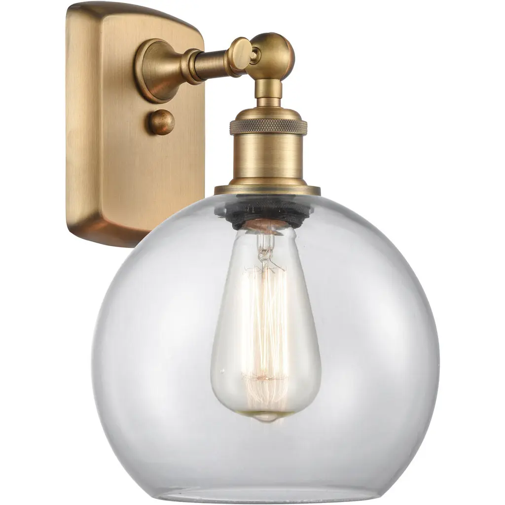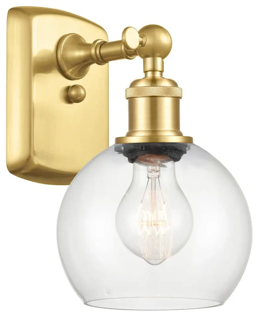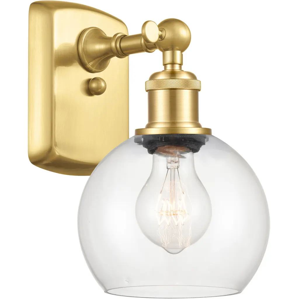 Innovations 516-1W-BB-G122-6-LED Athens 1 Light 6 inch Sconce Brushed Brass. Collection: Ballston. Style: Industrial, Modern Contempo, Restoration-Vintage, Transitional. Metal Finish: Brushed Brass. Metal Finish(Canopy/Backplate): Brushed Brass. Material: Steel, Cast Brass, Glass. Dimensions(in): 9.375(H) x 6(W) x 7.125(Ext). Bulb: (1)6W LED(Included). Maximum Wattage Per Socket: 100. Voltage: 120. Dimmable: Yes. Color Temperature (Kelvin): 2700. Color Rendering Index (CRI): 82. Lumens: 600. Life Expectancy (Hours): 15000. Glass Shade Description: Clear Athens. Glass Type: Transparent. Shade Shape: Globe/Orb. Glass or Metal Shade Color: Clear. Shade Material: Glass. Shade Dimensions(in): 6(W) x 5.125(H). Fitter Measurement (Glass or Metal Shade Fitter Size): Neckless with a 2.125 inch Hole. Backplate Dimenisons(in): 6(H) x 4.5(W) x 0.75(Depth). Mounting Center to Top: 3. Reversible (Can be hung with bulbs facing uo or down): Yes. California Proposition 65 Warning Required: Yes. UL and ETL Certification: Damp Location.