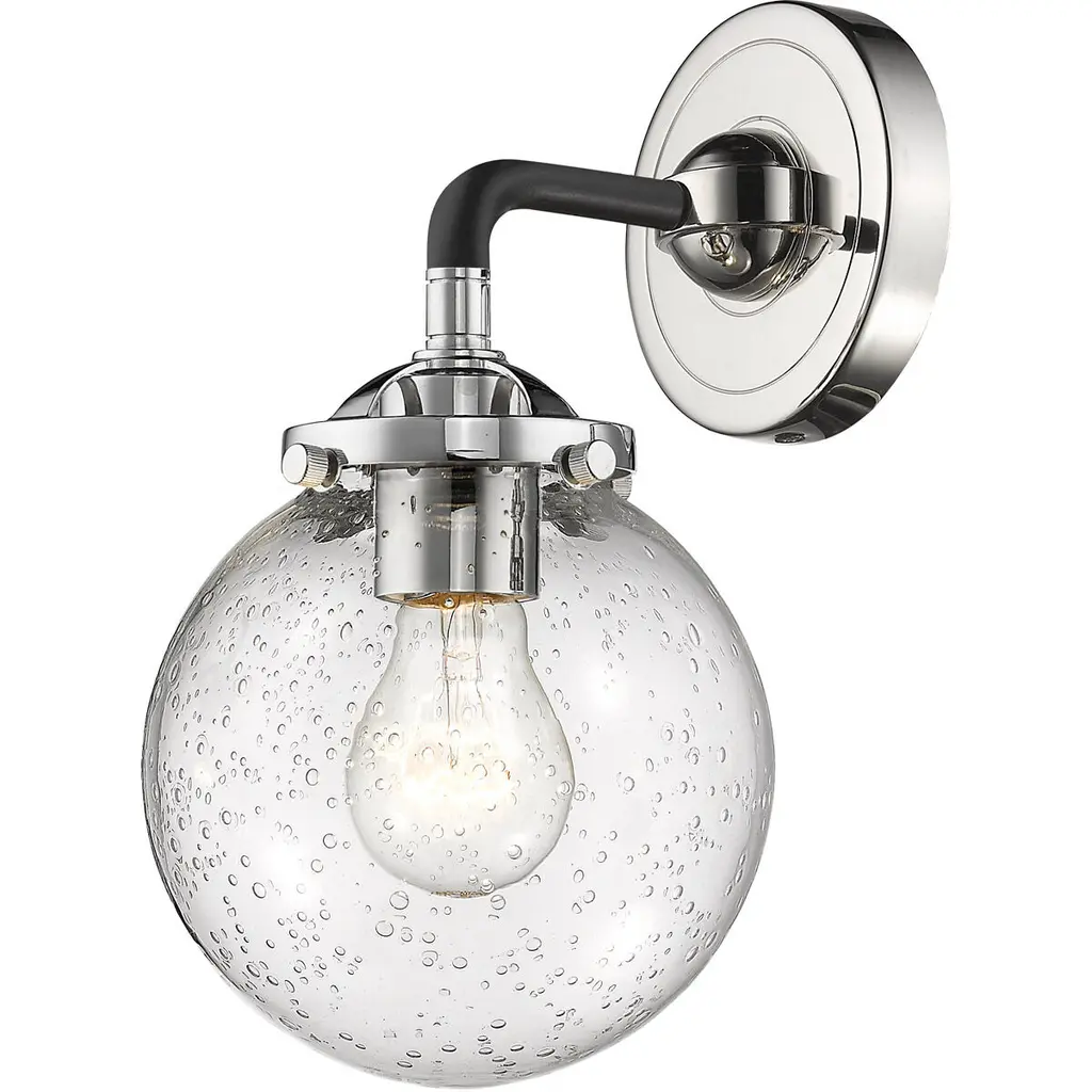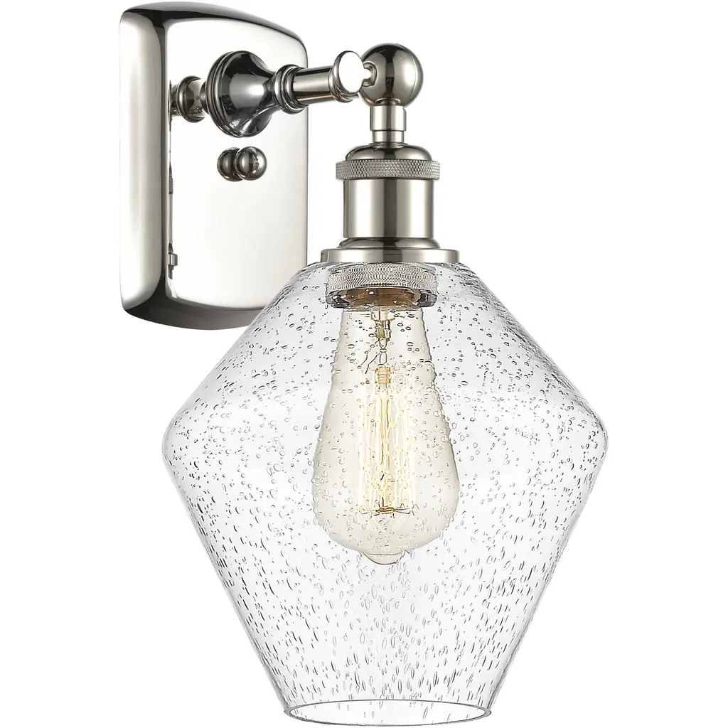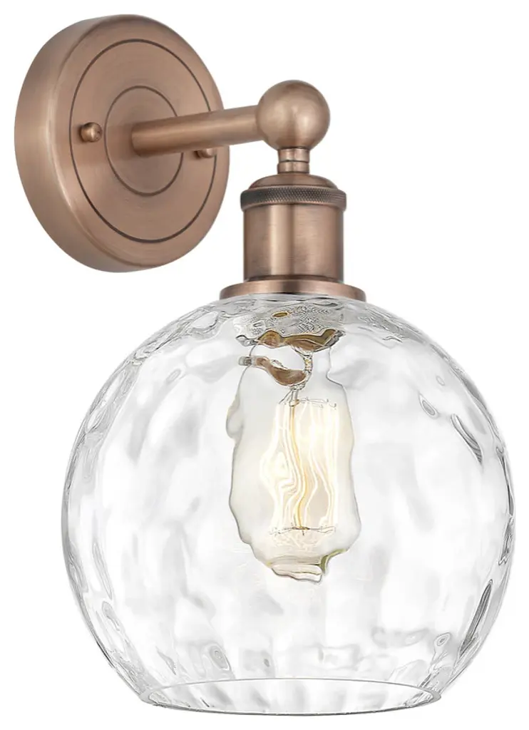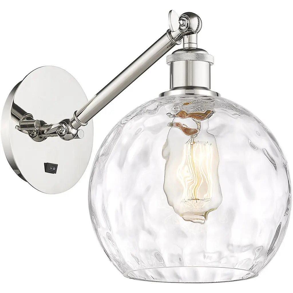 Innovations 516-1W-PN-G1215-8-LED Athens Water Glass 1 Light 8 inch Sconce Polished Nickel. Collection: Ballston. Style: Industrial, Modern Contempo, Restoration-Vintage, Transitional. Metal Finish: Polished Nickel. Metal Finish(Canopy/Backplate): Polished Nickel. Material: Steel, Cast Brass, Glass. Dimensions(in): 13(H) x 8(W) x 9(Ext). Bulb: (1)6W LED(Included). Maximum Wattage Per Socket: 100. Voltage: 120. Dimmable: Yes. Color Temperature (Kelvin): 2700. Color Rendering Index (CRI): 82. Lumens: 600. Life Expectancy (Hours): 15000. Glass Shade Description: Clear Athens Water Glass 8". Glass Type: Transparent. Shade Shape: Globe/Orb. Glass or Metal Shade Color: Clear Water Glass. Shade Material: Glass. Shade Dimensions(in): 8(W) x 7(H). Fitter Measurement (Glass or Metal Shade Fitter Size): Neckless with a 2.125 inch Hole. Backplate Dimenisons(in): 6(H) x 4.5(W) x 0.75(Depth). Mounting Center to Top: 3. Reversible (Can be hung with bulbs facing uo or down): Yes. California Proposition 65 Warning Required: Yes. UL and ETL Certification: Damp Location.