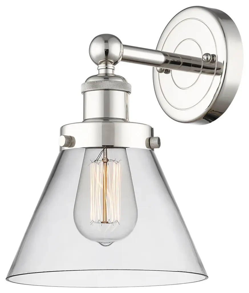 Innovations 516-1W-PN-GBC-82-LED Ballston Cone 1 Light 8 inch Sconce Polished Nickel. Collection: Ballston. Style: Industrial, Modern Contempo, Restoration-Vintage, Transitional. Metal Finish: Polished Nickel. Metal Finish(Canopy/Backplate): Polished Nickel. Material: Steel, Cast Brass, Glass. Dimensions(in): 11.25(H) x 8(W) x 8.125(Ext). Bulb: (1)6W LED(Included). Maximum Wattage Per Socket: 100. Voltage: 120. Dimmable: Yes. Color Temperature (Kelvin): 2700. Color Rendering Index (CRI): 82. Lumens: 600. Life Expectancy (Hours): 15000. Glass Shade Description: Clear Ballston Cone. Glass Type: Transparent. Shade Shape: Cone. Glass or Metal Shade Color: Clear. Shade Material: Glass. Shade Dimensions(in): 8(W) x 7(H). Fitter Measurement (Glass or Metal Shade Fitter Size): Neckless with a 2.125 inch Hole. Backplate Dimenisons(in): 6(H) x 4.5(W) x 0.75(Depth). Mounting Center to Top: 3. Reversible (Can be hung with bulbs facing uo or down): Yes. California Proposition 65 Warning Required: Yes. UL and ETL Certification: Damp Location.