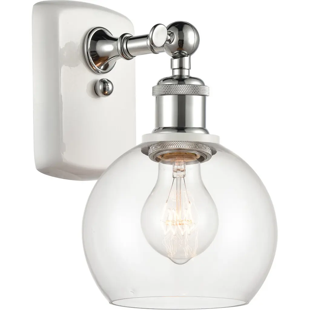 Innovations 516-1W-WPC-G122-6 1-Light Sconce White and Polished Chrome. Collection: Ballston. Style: Industrial, Modern Contempo, Restoration-Vintage, Transitional. Metal Finish: White and Polished Chrome. Metal Finish (Canopy/Backplate): White. Accent Color: Polished Chrome. Material: Steel, Cast Brass, Glass. Dimension(in): 9. 375(H) x 6(W) x 7. 125(Ext). Bulb: (1)60W Medium Base,Dimmable(Not Included). Maximum Wattage Per Socket: 100. Voltage: 120. Color Temperature (Kelvin): 2200. CRI: 99. 9. Lumens: 220. Glass Shade Description: Clear Athens. Glass or Metal Shade Color: Clear. Shade Material: Glass. Glass Type: Transparent. Shade Shape: Sphere. Shade Dimension(in): 6(W) x 5. 125(H). Fitter Measurement (Glass Or Metal Shade Fitter Size): Neckless with a 2. 125 inch Hole. Backplate Dimension(in): 6(H) x 4. 5(W) x 0. 75(Depth). ADA Compliant: No. California Proposition 65 Warning Required: Yes. UL and ETL Certification: Damp Location.