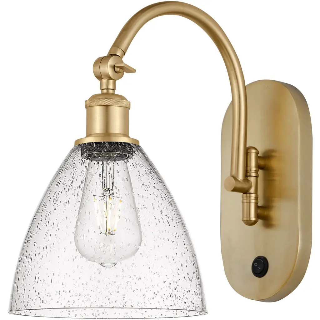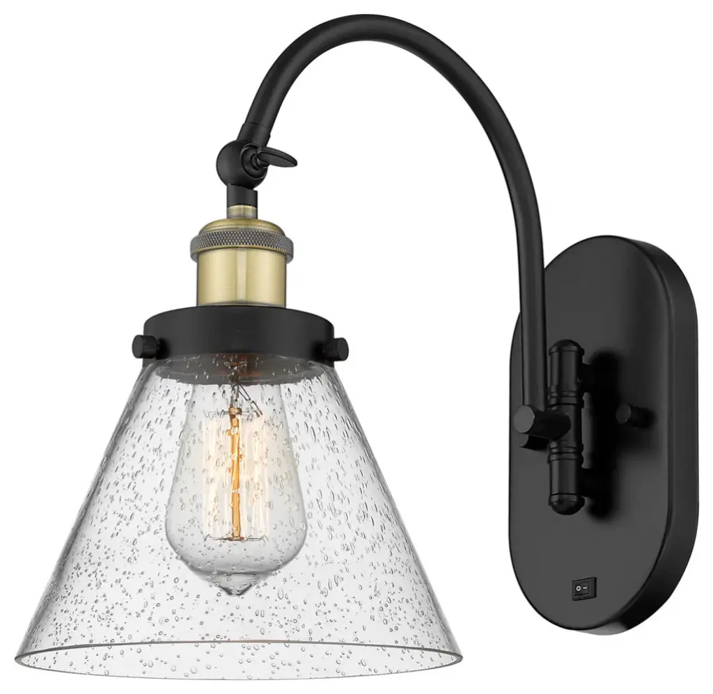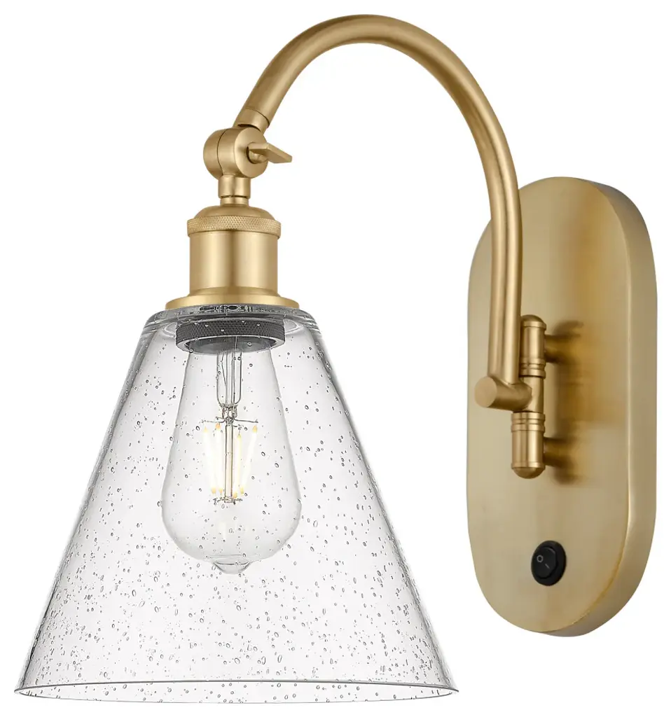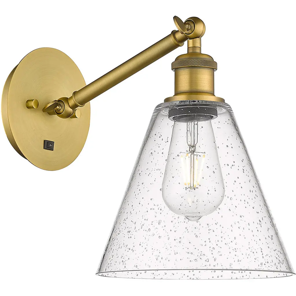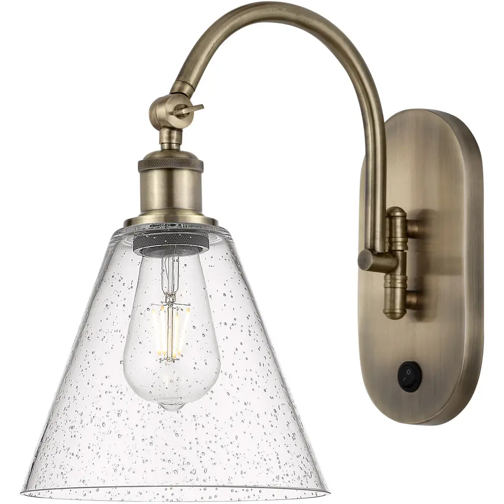 Innovations 518-1W-AB-GBC-84-LED 1-Light Sconce Antique Brass. Collection: Ballston. Style: Industrial, Modern Contempo, Restoration-Vintage, Transitional. Metal Finish: Antique Brass. Metal Finish (Canopy/Backplate): Antique Brass. Material: Steel, Cast Brass, Glass. Dimension(in): 13. 75(H) x 8(W) x 14(Ext). Bulb: (1)6W Medium Base,Dimmable(Not Included). Maximum Wattage Per Socket: 100. Voltage: 120. Color Temperature (Kelvin): 2700. CRI: 82. Lumens: 600. Glass Shade Description: Seedy Ballston Cone. Glass or Metal Shade Color: Seedy. Shade Material: Glass. Glass Type: Seeded. Shade Shape: Cone. Shade Dimension(in): 8(W) x 7(H). Fitter Measurement (Glass Or Metal Shade Fitter Size): Neckless with a 2. 125 inch Hole. Backplate Dimension(in): 5. 3(Dia) x 0. 75(Depth). ADA Compliant: No. California Proposition 65 Warning Required: Yes. UL and ETL Certification: Damp Location.