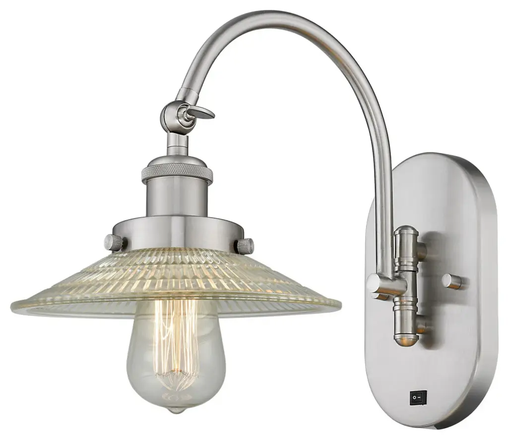 Innovations 518-1W-PC-G132 Orwell 1 Light 8.375 inch Sconce Polished Chrome. Collection: Ballston. Style: Industrial, Modern Contempo, Restoration-Vintage, Transitional. Metal Finish: Polished Chrome. Metal Finish(Canopy/Backplate): Polished Chrome. Material: Steel, Cast Brass, Glass. Dimensions(in): 11(H) x 8.375(W) x 14.1875(Ext). Bulb: (1)60W Medium Base Incandescent(Not Included). Maximum Wattage Per Socket: 100. Switch Type Included: On/Off Rocker Switch. Voltage: 120. Dimmable: Yes. Color Temperature (Kelvin): 2200. Color Rendering Index (CRI): 99.9. Lumens: 220. Life Expectancy (Hours): 2000. Glass Shade Description: Clear Orwell. Glass Type: Transparent. Shade Shape: Cone. Glass or Metal Shade Color: Clear. Shade Material: Glass. Shade Dimensions(in): 8.375(W) x 4(H). Fitter Measurement (Glass or Metal Shade Fitter Size): Neckless with a 2.125 inch Hole. Backplate Dimenisons(in): 7.875(H) x 4.5(W) x 0.75(Depth). Mounting Center to Top: 7.0625. ADA Compliant: No. Reversible (Can be hung with bulbs facing uo or down): Yes. California Proposition 65 Warning Required: Yes. UL and ETL Certification: Damp Location.