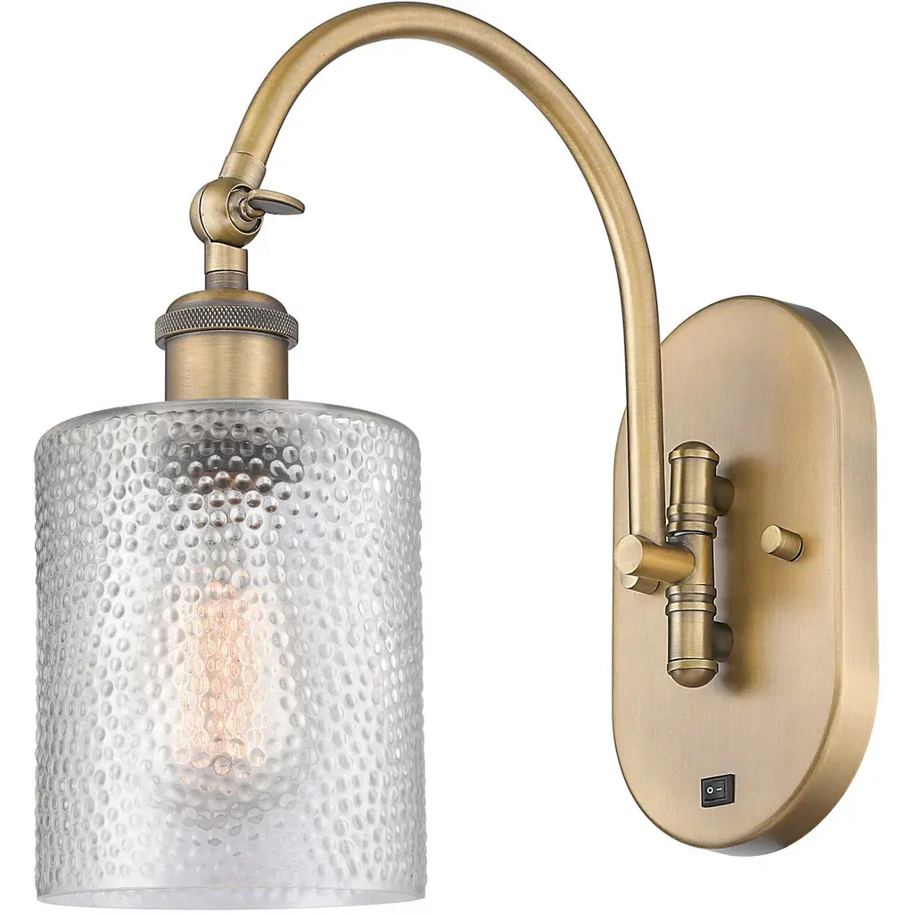 Innovations 518-1W-SG-G112 Cobbleskill 1 Light 5.3 inch Sconce Satin Gold. Collection: Ballston. Style: Art Nouveau, Industrial, Restoration-Vintage, Transitional. Metal Finish: Satin Gold. Metal Finish(Canopy/Backplate): Satin Gold. Material: Steel, Cast Brass, Glass. Dimensions(in): 12.75(H) x 5.3(W) x 12.5(Ext). Bulb: (1)60W Medium Base Incandescent(Not Included). Maximum Wattage Per Socket: 100. Switch Type Included: On/Off Rocker Switch. Voltage: 120. Dimmable: Yes. Color Temperature (Kelvin): 2200. Color Rendering Index (CRI): 99.9. Lumens: 220. Life Expectancy (Hours): 2000. Glass Shade Description: Clear Cobbleskill. Glass Type: Transparent; Water. Shade Shape: Drum. Glass or Metal Shade Color: Clear. Shade Material: Glass. Shade Dimensions(in): 5(W) x 6(H). Fitter Measurement (Glass or Metal Shade Fitter Size): Neckless with a 2.125 inch Hole. Backplate Dimenisons(in): 7.875(H) x 4.5(W) x 0.75(Depth). Mounting Center to Top: 7.0625. ADA Compliant: No. Reversible (Can be hung with bulbs facing uo or down): Yes. California Proposition 65 Warning Required: Yes. UL and ETL Certification: Damp Location.