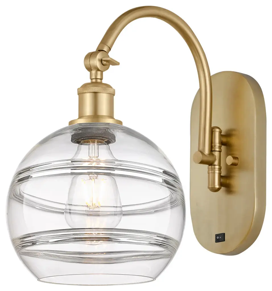 Innovations 518-1W-SG-G1213-8 Athens Deco Swirl 1 Light 8 inch Sconce Satin Gold. Collection: Ballston. Style: Industrial, Modern Contempo, Restoration-Vintage, Transitional. Metal Finish: Satin Gold. Metal Finish(Canopy/Backplate): Satin Gold. Material: Steel, Cast Brass, Glass. Dimensions(in): 13.75(H) x 8(W) x 14(Ext). Bulb: (1)60W Medium Base Incandescent(Not Included). Maximum Wattage Per Socket: 100. Switch Type Included: On/Off Rocker Switch. Voltage: 120. Dimmable: Yes. Color Temperature (Kelvin): 2200. Color Rendering Index (CRI): 99.9. Lumens: 220. Life Expectancy (Hours): 2000. Glass Shade Description: Clear Athens Deco Swirl 8". Glass Type: Transparent. Shade Shape: Globe/Orb. Glass or Metal Shade Color: Clear Deco Swirl. Shade Material: Glass. Shade Dimensions(in): 8(W) x 7(H). Fitter Measurement (Glass or Metal Shade Fitter Size): Neckless with a 2.125 inch Hole. Backplate Dimenisons(in): 7.875(H) x 4.5(W) x 0.75(Depth). Mounting Center to Top: 7.0625. ADA Compliant: No. Reversible (Can be hung with bulbs facing uo or down): Yes. California Proposition 65 Warning Required: Yes. UL and ETL Certification: Damp Location.