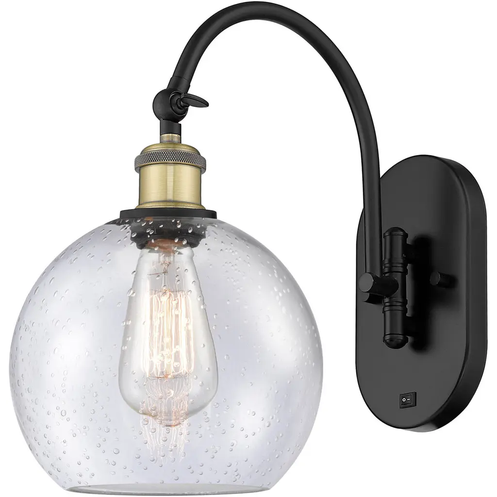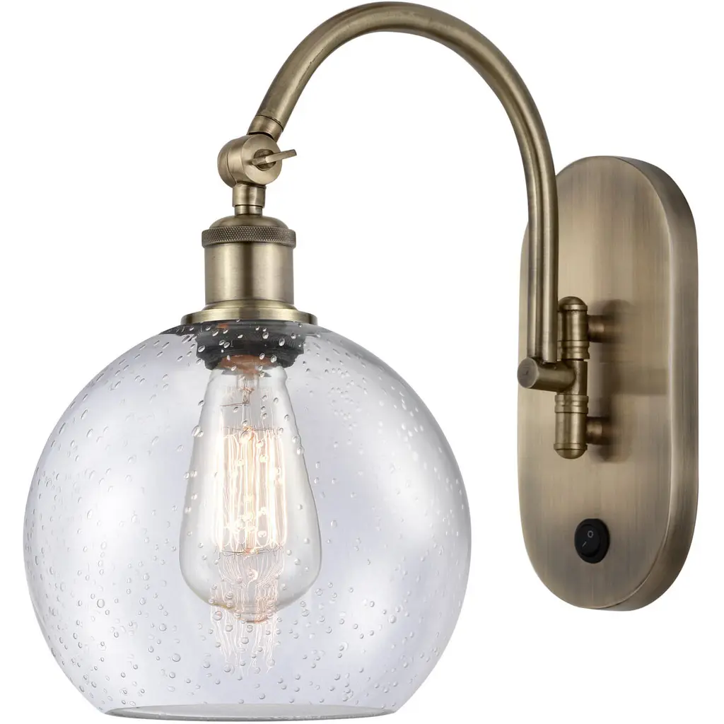 Innovations 518-1W-SG-G124-8 Athens 1 Light 8 inch Sconce Satin Gold. Collection: Ballston. Style: Industrial, Modern Contempo, Restoration-Vintage, Transitional. Metal Finish: Satin Gold. Metal Finish(Canopy/Backplate): Satin Gold. Material: Steel, Cast Brass, Glass. Dimensions(in): 13.75(H) x 8(W) x 14(Ext). Bulb: (1)60W Medium Base Incandescent(Not Included). Maximum Wattage Per Socket: 100. Switch Type Included: On/Off Rocker Switch. Voltage: 120. Dimmable: Yes. Color Temperature (Kelvin): 2200. Color Rendering Index (CRI): 99.9. Lumens: 220. Life Expectancy (Hours): 2000. Glass Shade Description: Seedy Athens. Glass Type: Seeded. Shade Shape: Globe/Orb. Glass or Metal Shade Color: Seedy. Shade Material: Glass. Shade Dimensions(in): 8(W) x 7(H). Fitter Measurement (Glass or Metal Shade Fitter Size): Neckless with a 2.125 inch Hole. Backplate Dimenisons(in): 7.875(H) x 4.5(W) x 0.75(Depth). Mounting Center to Top: 7.0625. ADA Compliant: No. Reversible (Can be hung with bulbs facing uo or down): Yes. California Proposition 65 Warning Required: Yes. UL and ETL Certification: Damp Location.