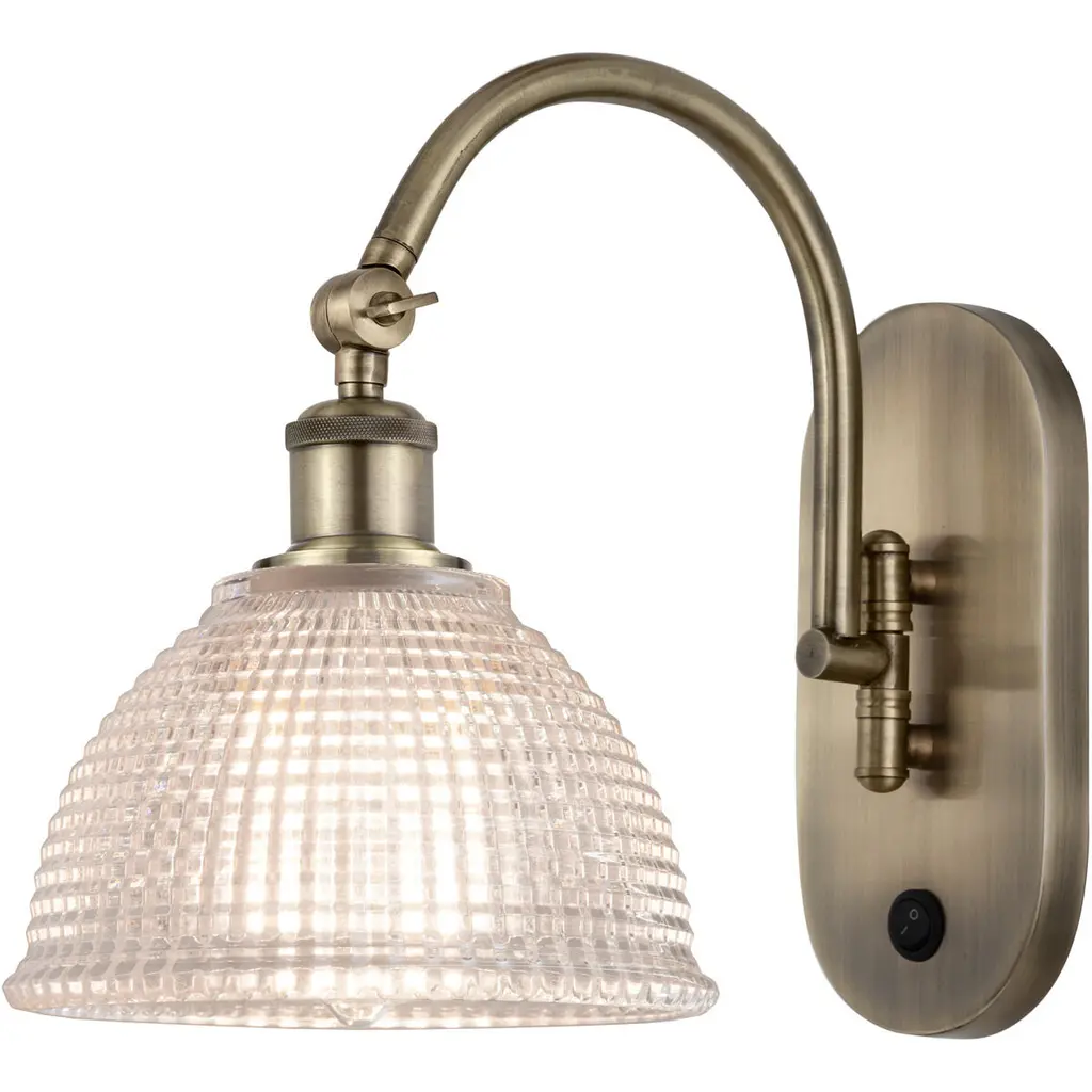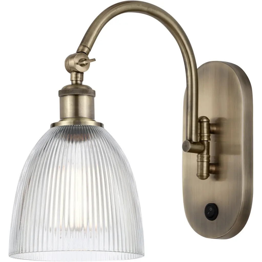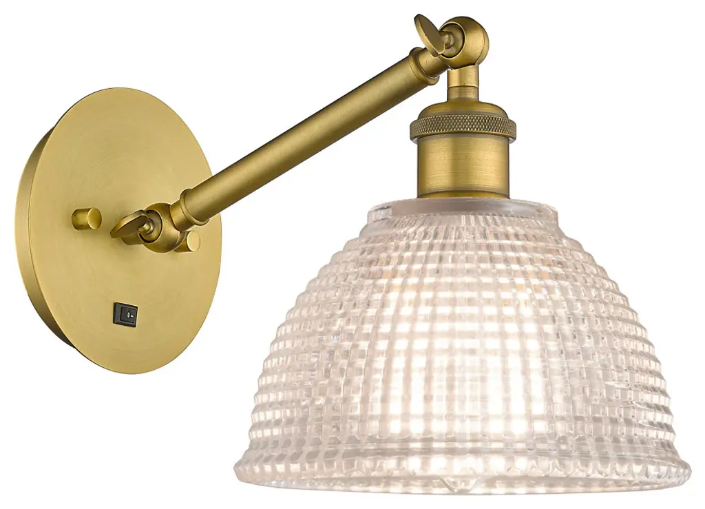 Innovations 518-1W-SG-G422 Arietta 1 Light 8 inch Sconce Satin Gold. Collection: Ballston. Style: Industrial, Modern Contempo, Restoration-Vintage, Transitional. Metal Finish: Satin Gold. Metal Finish(Canopy/Backplate): Satin Gold. Material: Steel, Cast Brass, Glass. Dimensions(in): 11.75(H) x 8(W) x 14(Ext). Bulb: (1)60W Medium Base Incandescent(Not Included). Maximum Wattage Per Socket: 100. Switch Type Included: On/Off Rocker Switch. Voltage: 120. Dimmable: Yes. Color Temperature (Kelvin): 2200. Color Rendering Index (CRI): 99.9. Lumens: 220. Life Expectancy (Hours): 2000. Glass Shade Description: Clear Arietta. Glass Type: Transparent. Shade Shape: Dome. Glass or Metal Shade Color: Clear. Shade Material: Glass. Shade Dimensions(in): 8(W) x 5(H). Fitter Measurement (Glass or Metal Shade Fitter Size): Neckless with a 2.125 inch Hole. Backplate Dimenisons(in): 7.875(H) x 4.5(W) x 0.75(Depth). Mounting Center to Top: 7.0625. ADA Compliant: No. Reversible (Can be hung with bulbs facing uo or down): Yes. California Proposition 65 Warning Required: Yes. UL and ETL Certification: Damp Location.