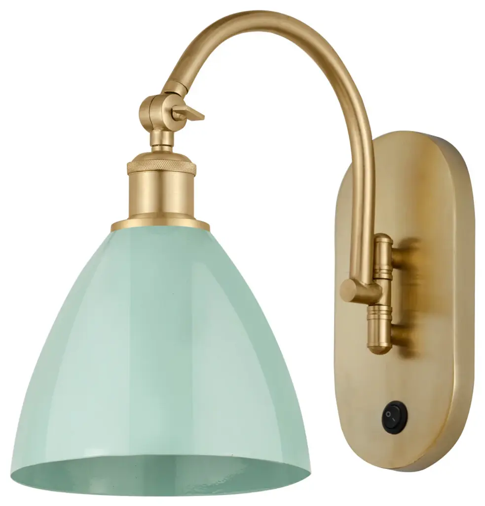 Innovations 518-1W-SG-MBD-75-BL Plymouth Dome 1 Light 7.5 inch Sconce Satin Gold. Collection: Ballston. Style: Industrial, Farmhouse, Restoration-Vintage. Metal Finish: Satin Gold. Metal Finish(Shade): Matte Blue. Metal Finish(Canopy/Backplate): Satin Gold. Material: Steel, Cast Brass. Dimensions(in): 13.25(H) x 7.5(W) x 13.75(Ext). Bulb: (1)60W Medium Base Incandescent(Not Included). Maximum Wattage Per Socket: 100. Switch Type Included: On/Off Rocker Switch. Voltage: 120. Dimmable: Yes. Color Temperature (Kelvin): 2200. Color Rendering Index (CRI): 99.9. Lumens: 220. Life Expectancy (Hours): 2000. Shade Shape: Cone. Glass or Metal Shade Color: Blue. Shade Material: Metal. Metal Shade Description: Blue Plymouth Dome. Shade Dimensions(in): 7.5(W) x 6.5(H). Fitter Measurement (Glass or Metal Shade Fitter Size): Neckless with a 2.125 inch Hole. Backplate Dimenisons(in): 7.875(H) x 4.5(W) x 0.75(Depth). Mounting Center to Top: 7.0625. ADA Compliant: No. Reversible (Can be hung with bulbs facing uo or down): Yes. California Proposition 65 Warning Required: Yes. UL and ETL Certification: Damp Location.