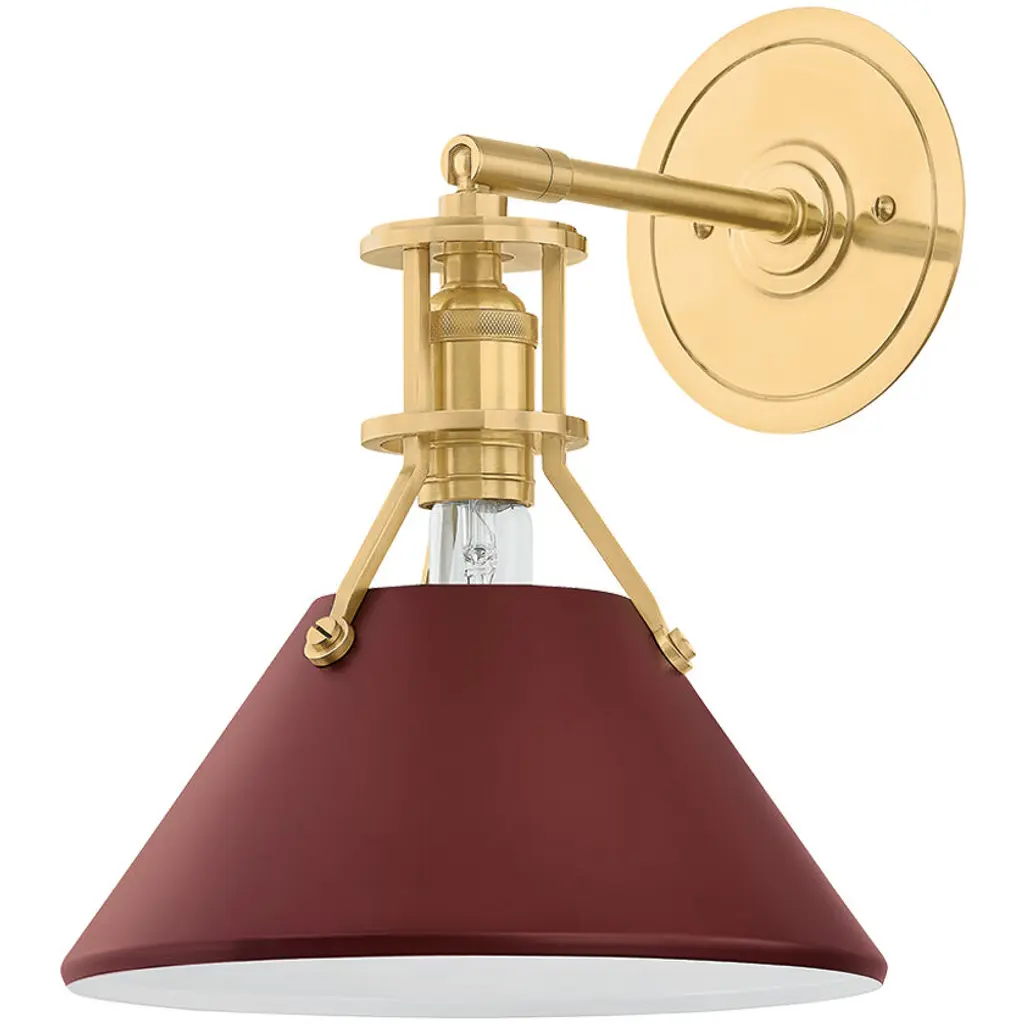 Innovations 518-1W-SG-MBD-75-RD-LED Plymouth Dome 1 Light 7.5 inch Sconce Satin Gold. Collection: Ballston. Style: Industrial, Farmhouse, Restoration-Vintage. Metal Finish: Satin Gold. Metal Finish(Shade): Matte Red. Metal Finish(Canopy/Backplate): Satin Gold. Material: Steel, Cast Brass. Dimensions(in): 13.25(H) x 7.5(W) x 13.75(Ext). Bulb: (1)6W LED(Included). Maximum Wattage Per Socket: 100. Switch Type Included: On/Off Rocker Switch. Voltage: 120. Dimmable: Yes. Color Temperature (Kelvin): 2700. Color Rendering Index (CRI): 82. Lumens: 600. Life Expectancy (Hours): 15000. Shade Shape: Cone. Glass or Metal Shade Color: Red. Shade Material: Metal. Metal Shade Description: Red Plymouth Dome. Shade Dimensions(in): 7.5(W) x 6.5(H). Fitter Measurement (Glass or Metal Shade Fitter Size): Neckless with a 2.125 inch Hole. Backplate Dimenisons(in): 7.875(H) x 4.5(W) x 0.75(Depth). Mounting Center to Top: 7.0625. ADA Compliant: No. Reversible (Can be hung with bulbs facing uo or down): Yes. California Proposition 65 Warning Required: Yes. UL and ETL Certification: Damp Location.