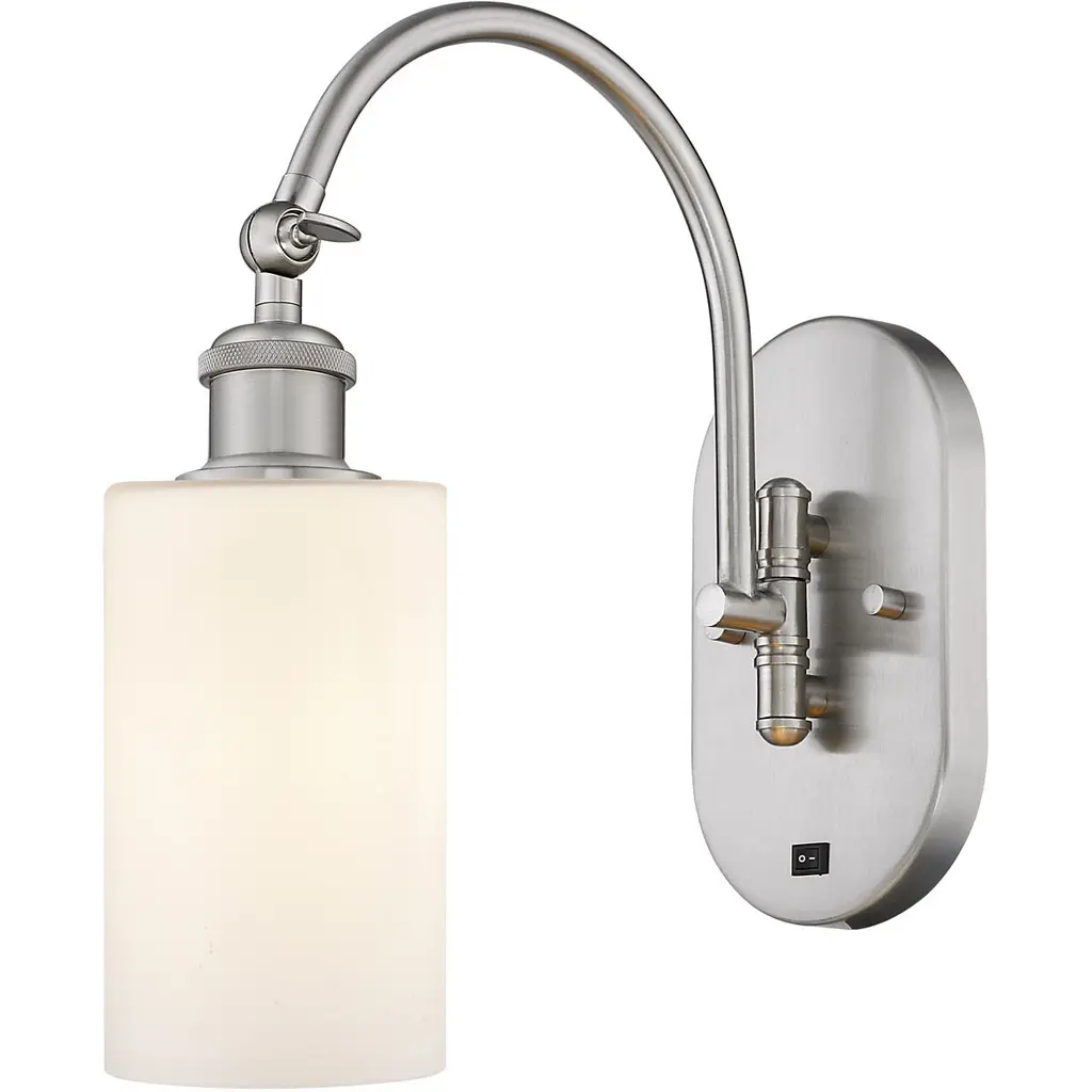 Innovations 518-1W-SN-G801 Clymer 1 Light 5.3 inch Sconce Brushed Satin Nickel. Collection: Ballston. Style: Art Nouveau, Transitional, Modern. Metal Finish: Brushed Satin Nickel. Metal Finish(Canopy/Backplate): Brushed Satin Nickel. Material: Steel, Cast Brass, Glass. Dimensions(in): 12.625(H) x 5.3(W) x 11.9375(Ext). Bulb: (1)60W Medium Base Incandescent(Not Included). Maximum Wattage Per Socket: 100. Switch Type Included: On/Off Rocker Switch. Voltage: 120. Dimmable: Yes. Color Temperature (Kelvin): 2200. Color Rendering Index (CRI): 99.9. Lumens: 220. Life Expectancy (Hours): 2000. Glass Shade Description: Matte White Clymer. Glass Type: Frosted. Shade Shape: Cylinder. Glass or Metal Shade Color: Matte White. Shade Material: Glass. Shade Dimensions(in): 3.875(W) x 5.875(H). Fitter Measurement (Glass or Metal Shade Fitter Size): Neckless with a 1.625 inch Hole. Backplate Dimenisons(in): 7.875(H) x 4.5(W) x 0.75(Depth). Mounting Center to Top: 7.0625. ADA Compliant: No. Reversible (Can be hung with bulbs facing uo or down): Yes. California Proposition 65 Warning Required: Yes. UL and ETL Certification: Damp Location.