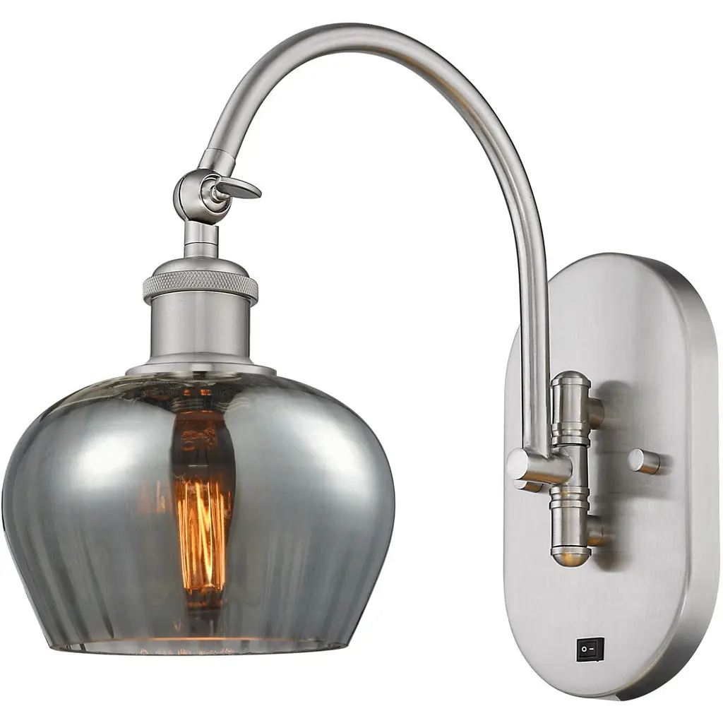 Innovations 518-1W-SN-G93 Fenton 1 Light 6.5 inch Sconce Brushed Satin Nickel. Collection: Ballston. Style: Art Nouveau, Industrial, Restoration-Vintage, Transitional. Metal Finish: Brushed Satin Nickel. Metal Finish(Canopy/Backplate): Brushed Satin Nickel. Material: Steel, Cast Brass, Glass. Dimensions(in): 11.25(H) x 6.5(W) x 13.25(Ext). Bulb: (1)60W Medium Base Incandescent(Not Included). Maximum Wattage Per Socket: 100. Switch Type Included: On/Off Rocker Switch. Voltage: 120. Dimmable: Yes. Color Temperature (Kelvin): 2200. Color Rendering Index (CRI): 99.9. Lumens: 220. Life Expectancy (Hours): 2000. Glass Shade Description: Plated Smoke Fenton. Glass Type: Colorful; Ribbed. Shade Shape: Bowl. Glass or Metal Shade Color: Plated Smoke. Shade Material: Glass. Shade Dimensions(in): 6.5(W) x 4.5(H). Fitter Measurement (Glass or Metal Shade Fitter Size): Neckless with a 2.125 inch Hole. Backplate Dimenisons(in): 7.875(H) x 4.5(W) x 0.75(Depth). Mounting Center to Top: 7.0625. ADA Compliant: No. Reversible (Can be hung with bulbs facing uo or down): Yes. California Proposition 65 Warning Required: Yes. UL and ETL Certification: Damp Location.