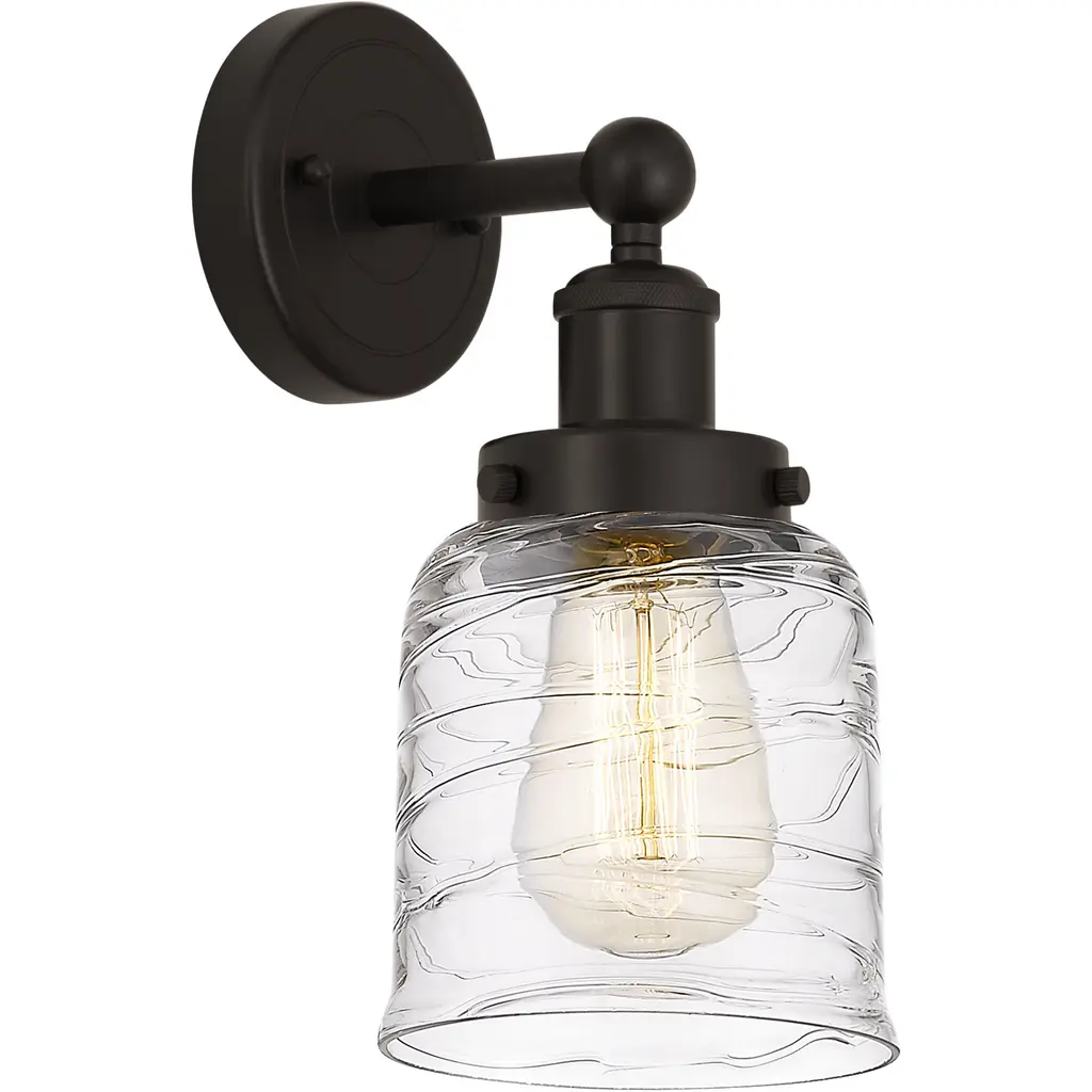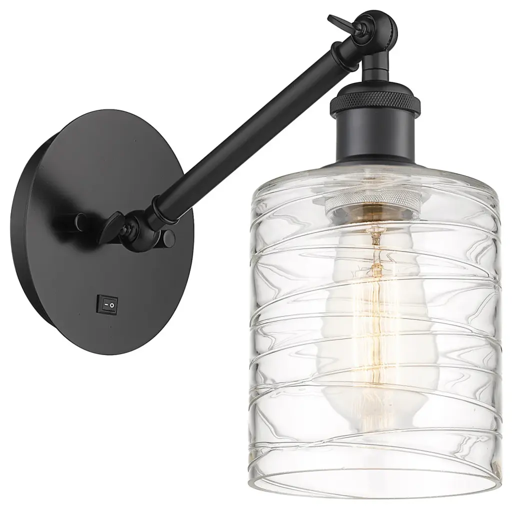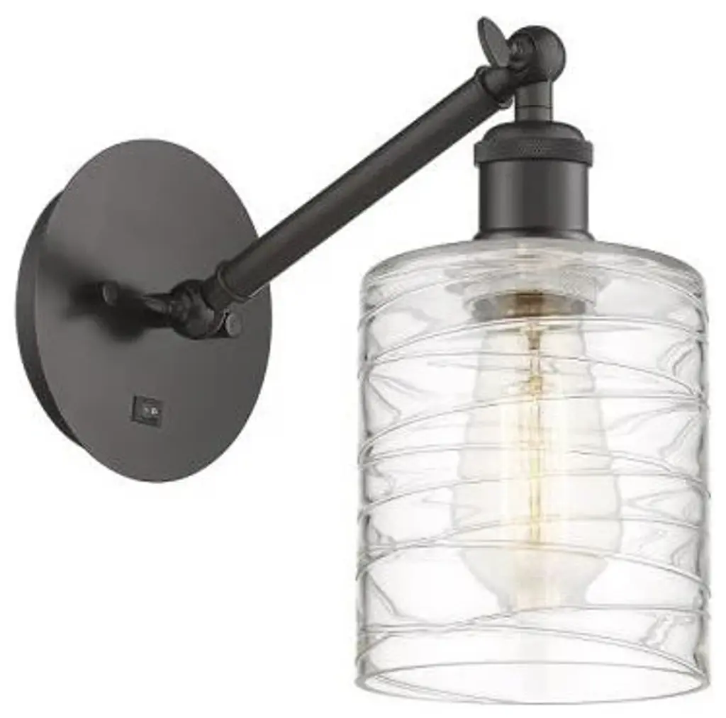 Innovations 616-1W-OB-G1113 Cobbleskill 1 Light 5 inch Sconce Oil Rubbed Bronze. Collection: Edison. Style: Art Nouveau, Industrial, Restoration-Vintage, Transitional. Metal Finish: Oil Rubbed Bronze. Metal Finish(Canopy/Backplate): Oil Rubbed Bronze. Material: Steel, Cast Brass, Glass. Dimensions(in): 11.5(H) x 5(W) x 7(Ext). Bulb: (1)60W Medium Base Incandescent(Not Included). Maximum Wattage Per Socket: 100. Voltage: 120. Dimmable: Yes. Color Temperature (Kelvin): 2200. Color Rendering Index (CRI): 99.9. Lumens: 220. Life Expectancy (Hours): 2000. Glass Shade Description: Deco Swirl Cobbleskill. Glass Type: Transparent. Shade Shape: Drum. Glass or Metal Shade Color: Deco Swirl. Shade Material: Glass. Shade Dimensions(in): 5(W) x 6(H). Fitter Measurement (Glass or Metal Shade Fitter Size): Neckless with a 2.125 inch Hole. Backplate Dimenisons(in): 4.5(W) x 0.75(Depth). Mounting Center to Top: 2.5. ADA Compliant: No. Reversible (Can be hung with bulbs facing uo or down): Yes. California Proposition 65 Warning Required: Yes. UL and ETL Certification: Damp Location.