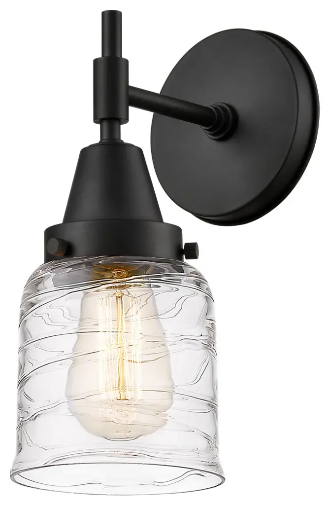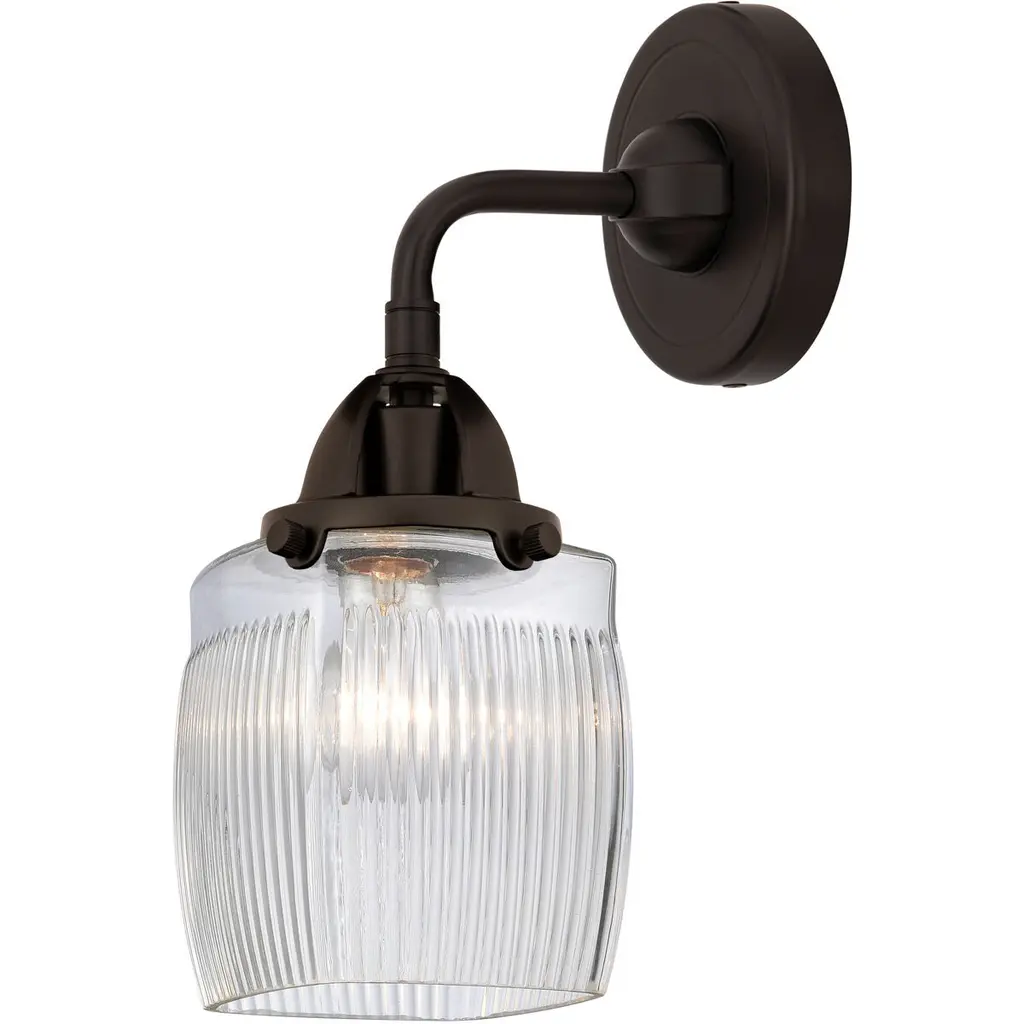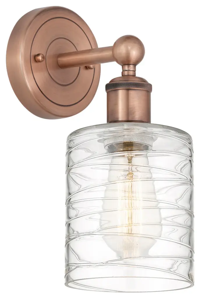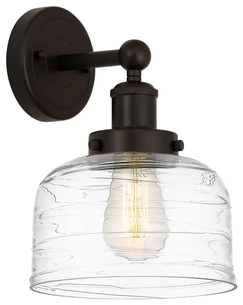 Innovations 616-1W-OB-G1113 Cobbleskill 1 Light 5 inch Sconce Oil Rubbed Bronze. Collection: Edison. Style: Art Nouveau, Industrial, Restoration-Vintage, Transitional. Metal Finish: Oil Rubbed Bronze. Metal Finish(Canopy/Backplate): Oil Rubbed Bronze. Material: Steel, Cast Brass, Glass. Dimensions(in): 11.5(H) x 5(W) x 7(Ext). Bulb: (1)60W Medium Base Incandescent(Not Included). Maximum Wattage Per Socket: 100. Voltage: 120. Dimmable: Yes. Color Temperature (Kelvin): 2200. Color Rendering Index (CRI): 99.9. Lumens: 220. Life Expectancy (Hours): 2000. Glass Shade Description: Deco Swirl Cobbleskill. Glass Type: Transparent. Shade Shape: Drum. Glass or Metal Shade Color: Deco Swirl. Shade Material: Glass. Shade Dimensions(in): 5(W) x 6(H). Fitter Measurement (Glass or Metal Shade Fitter Size): Neckless with a 2.125 inch Hole. Backplate Dimenisons(in): 4.5(W) x 0.75(Depth). Mounting Center to Top: 2.5. ADA Compliant: No. Reversible (Can be hung with bulbs facing uo or down): Yes. California Proposition 65 Warning Required: Yes. UL and ETL Certification: Damp Location.