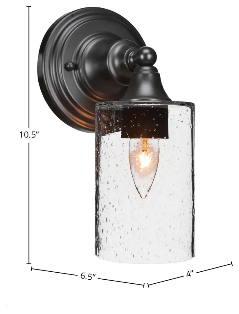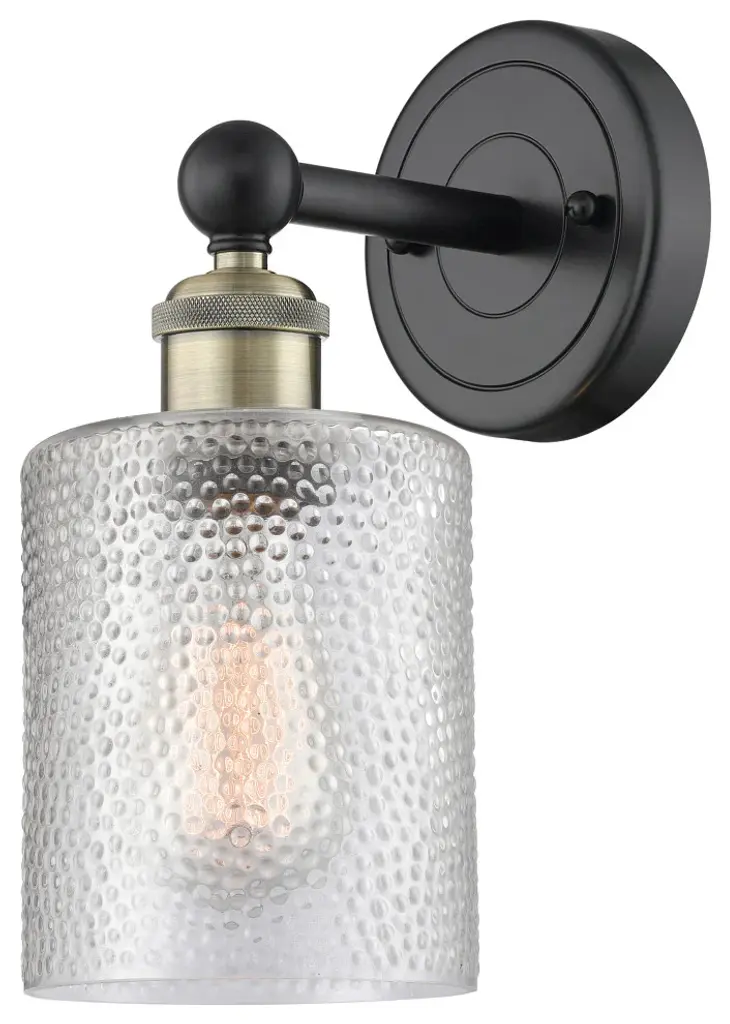Innovations 616-1W-OB-G112 Cobbleskill 1 Light 5 inch Sconce Oil Rubbed Bronze. Collection: Edison. Style: Art Nouveau, Industrial, Restoration-Vintage, Transitional. Metal Finish: Oil Rubbed Bronze. Metal Finish(Canopy/Backplate): Oil Rubbed Bronze. Material: Steel, Cast Brass, Glass. Dimensions(in): 11.5(H) x 5(W) x 7(Ext). Bulb: (1)60W Medium Base Incandescent(Not Included). Maximum Wattage Per Socket: 100. Voltage: 120. Dimmable: Yes. Color Temperature (Kelvin): 2200. Color Rendering Index (CRI): 99.9. Lumens: 220. Life Expectancy (Hours): 2000. Glass Shade Description: Clear Cobbleskill. Glass Type: Transparent; Water. Shade Shape: Drum. Glass or Metal Shade Color: Clear. Shade Material: Glass. Shade Dimensions(in): 5(W) x 6(H). Fitter Measurement (Glass or Metal Shade Fitter Size): Neckless with a 2.125 inch Hole. Backplate Dimenisons(in): 4.5(W) x 0.75(Depth). Mounting Center to Top: 2.5. ADA Compliant: No. Reversible (Can be hung with bulbs facing uo or down): Yes. California Proposition 65 Warning Required: Yes. UL and ETL Certification: Damp Location.