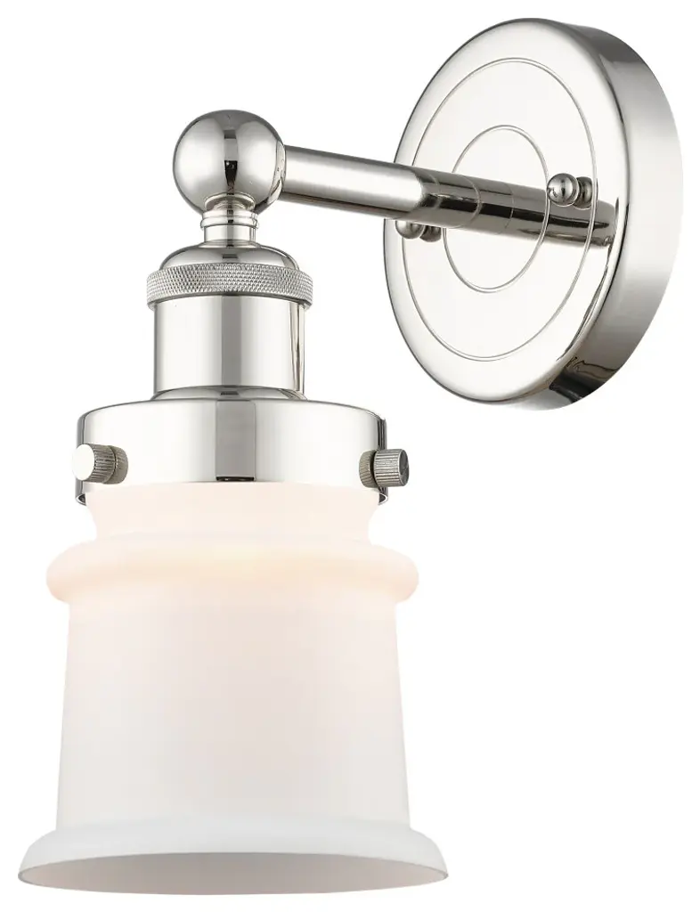 Innovations 616-1W-PC-G181S Small Canton 1 Light Sconce part of the Edison Collection Polished Chrome. Collection: Edison. Style: Industrial, Farmhouse, Seaside, Nautical, Restoration-Vintage, Traditional. Metal Finish: Polished Chrome. Metal Finish(Canopy/Backplate): Polished Chrome. Material: Steel, Cast Brass, Glass. Dimensions(in): 11.5(H) x 5.25(W) x 7.125(Ext). Bulb: (1)60W Medium Base Incandescent(Not Included). Maximum Wattage Per Socket: 100. Voltage: 120. Dimmable: Yes. Color Temperature (Kelvin): 2200. Color Rendering Index (CRI): 99.9. Lumens: 220. Life Expectancy (Hours): 2000. Glass Shade Description: Matte White Small Canton. Glass Type: Frosted. Shade Shape: Bell/Urn. Glass or Metal Shade Color: Matte White. Shade Material: Glass. Shade Dimensions(in): 5.25(W) x 5.5(H). Fitter Measurement (Glass or Metal Shade Fitter Size): 3.25 inch Fitter. Canopy Dimensions(in): 4.5(Dia). Backplate Dimenisons(in): 4.5(Dia) x 0.75(Depth). Mounting Center to Top: 2.25. Reversible (Can be hung with bulbs facing uo or down): Yes. Duo Mount: Yes. California Proposition 65 Warning Required: Yes. UL and ETL Certification: Damp Location.