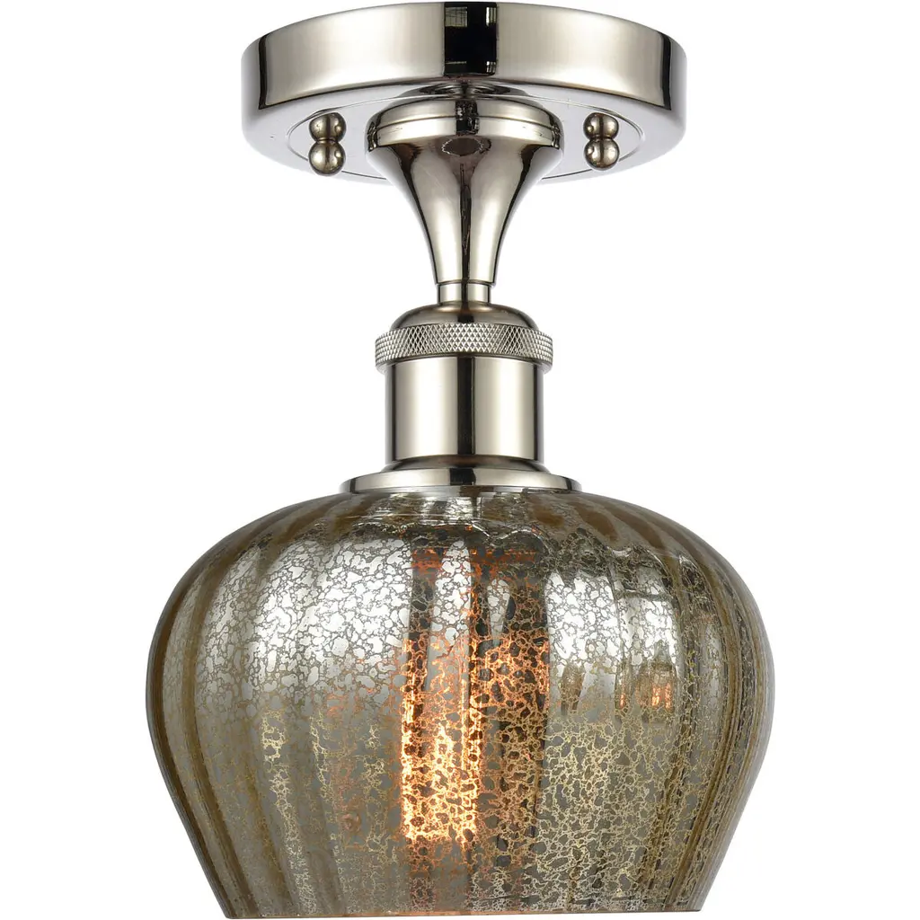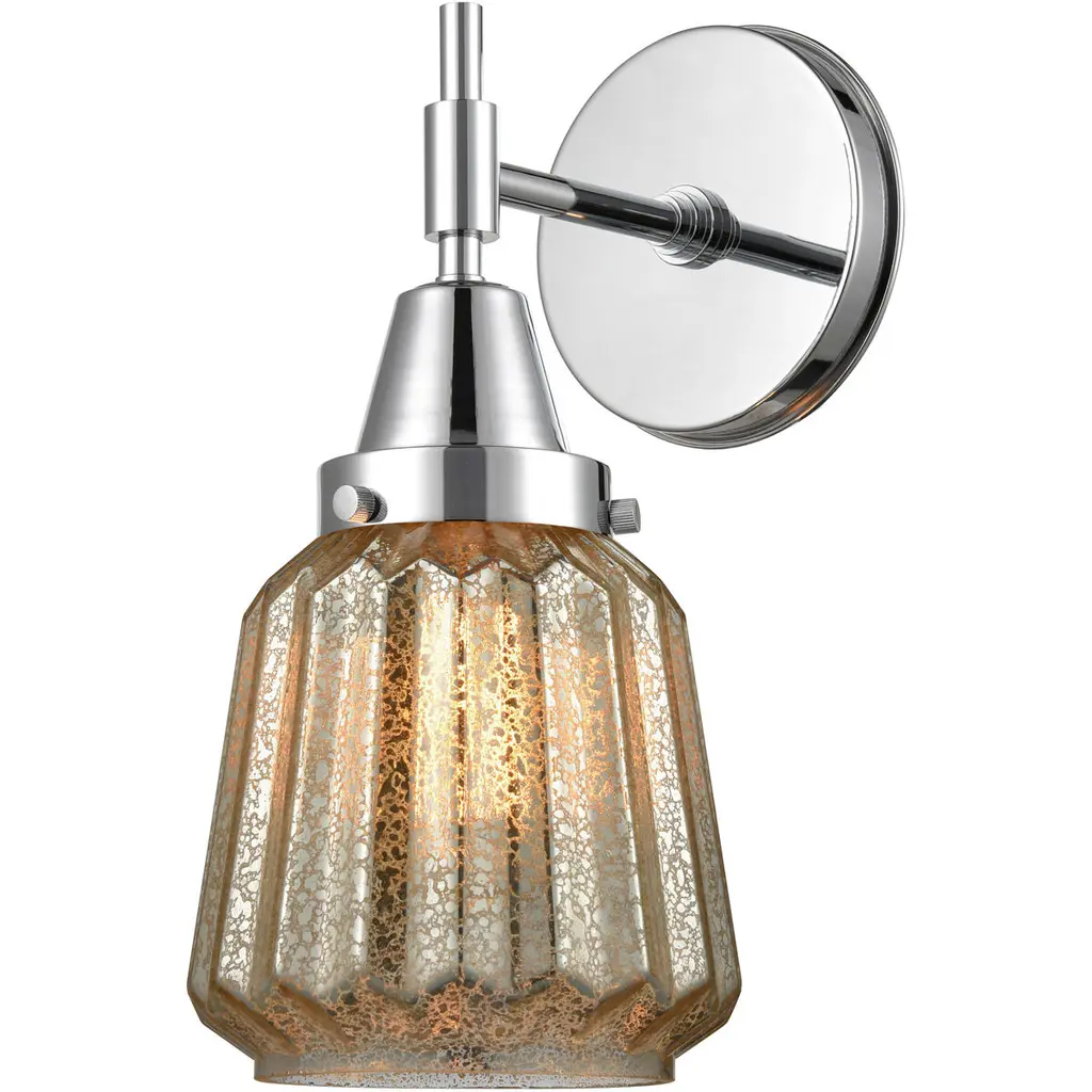 Innovations 616-1W-PC-G96 Fenton 1 Light 6.5 inch Sconce Polished Chrome. Collection: Edison. Style: Art Nouveau, Industrial, Restoration-Vintage, Transitional. Metal Finish: Polished Chrome. Metal Finish(Canopy/Backplate): Polished Chrome. Material: Steel, Cast Brass, Glass. Dimensions(in): 10(H) x 6.5(W) x 7.75(Ext). Bulb: (1)60W Medium Base Incandescent(Not Included). Maximum Wattage Per Socket: 100. Voltage: 120. Dimmable: Yes. Color Temperature (Kelvin): 2200. Color Rendering Index (CRI): 99.9. Lumens: 220. Life Expectancy (Hours): 2000. Glass Shade Description: Mercury Fenton. Glass Type: Mercury; Ribbed. Shade Shape: Bowl. Glass or Metal Shade Color: Mercury. Shade Material: Glass. Shade Dimensions(in): 6.5(W) x 4.5(H). Fitter Measurement (Glass or Metal Shade Fitter Size): Neckless with a 2.125 inch Hole. Backplate Dimenisons(in): 4.5(W) x 0.75(Depth). Mounting Center to Top: 2.5. ADA Compliant: No. Reversible (Can be hung with bulbs facing uo or down): Yes. California Proposition 65 Warning Required: Yes. UL and ETL Certification: Damp Location.