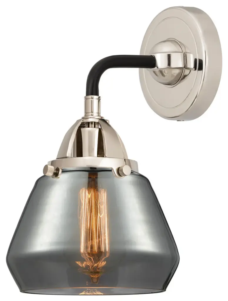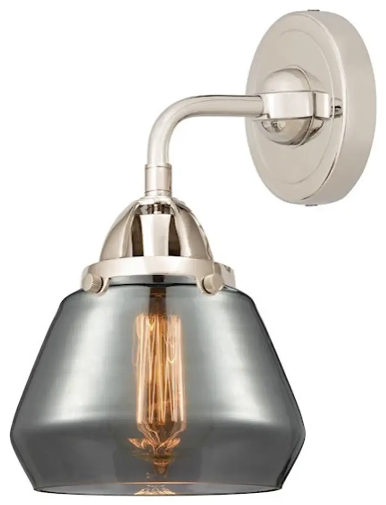 Innovations 616-1W-SN-G93 Fenton 1 Light 6.5 inch Sconce Brushed Satin Nickel. Collection: Edison. Style: Art Nouveau, Industrial, Restoration-Vintage, Transitional. Metal Finish: Brushed Satin Nickel. Metal Finish(Canopy/Backplate): Brushed Satin Nickel. Material: Steel, Cast Brass, Glass. Dimensions(in): 10(H) x 6.5(W) x 7.75(Ext). Bulb: (1)60W Medium Base Incandescent(Not Included). Maximum Wattage Per Socket: 100. Voltage: 120. Dimmable: Yes. Color Temperature (Kelvin): 2200. Color Rendering Index (CRI): 99.9. Lumens: 220. Life Expectancy (Hours): 2000. Glass Shade Description: Plated Smoke Fenton. Glass Type: Colorful; Ribbed. Shade Shape: Bowl. Glass or Metal Shade Color: Plated Smoke. Shade Material: Glass. Shade Dimensions(in): 6.5(W) x 4.5(H). Fitter Measurement (Glass or Metal Shade Fitter Size): Neckless with a 2.125 inch Hole. Backplate Dimenisons(in): 4.5(W) x 0.75(Depth). Mounting Center to Top: 2.5. ADA Compliant: No. Reversible (Can be hung with bulbs facing uo or down): Yes. California Proposition 65 Warning Required: Yes. UL and ETL Certification: Damp Location.