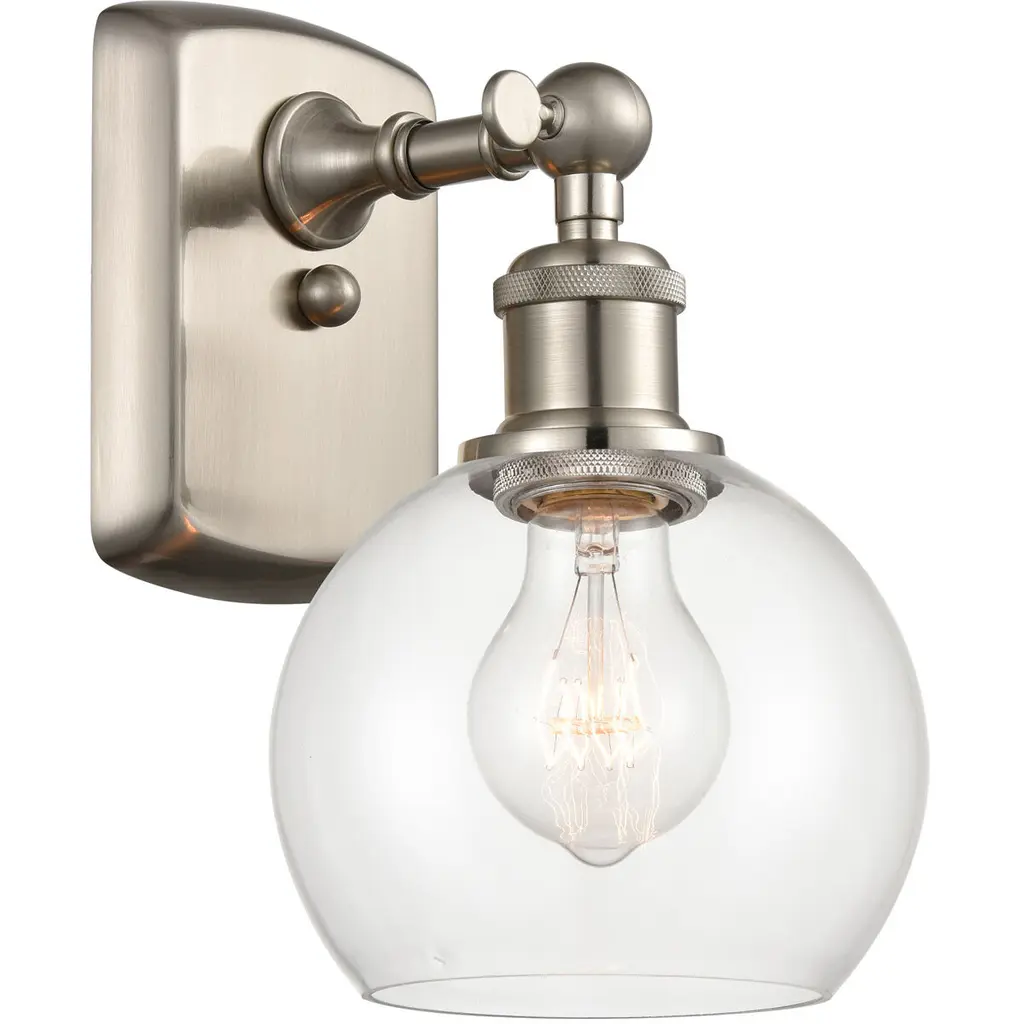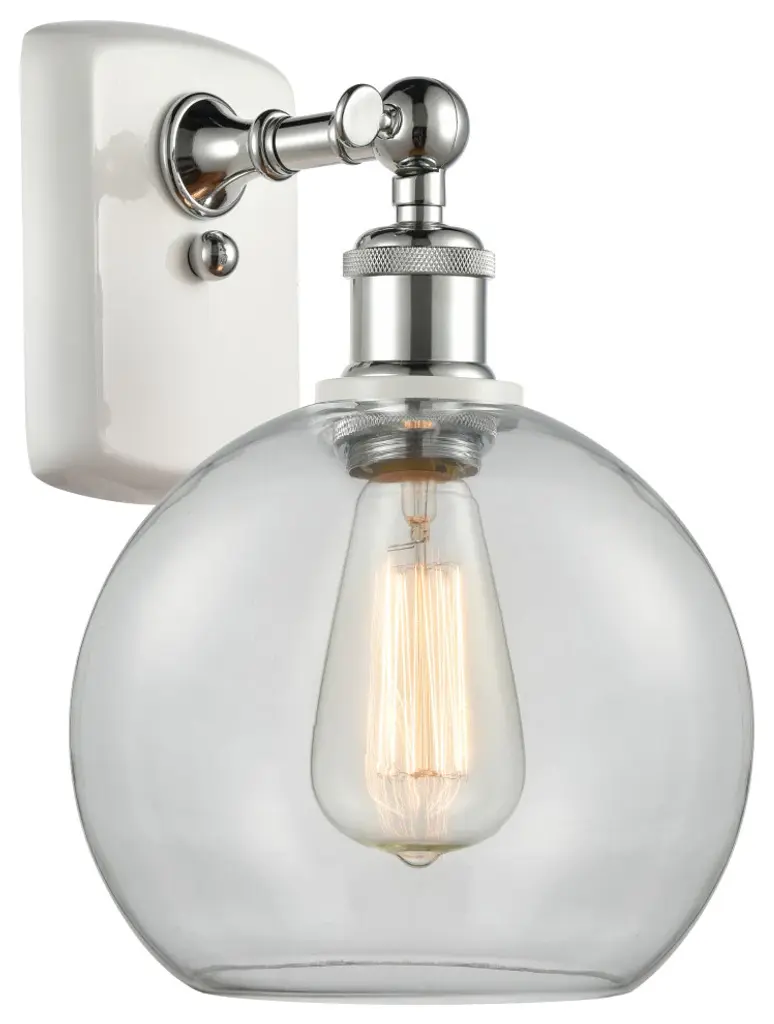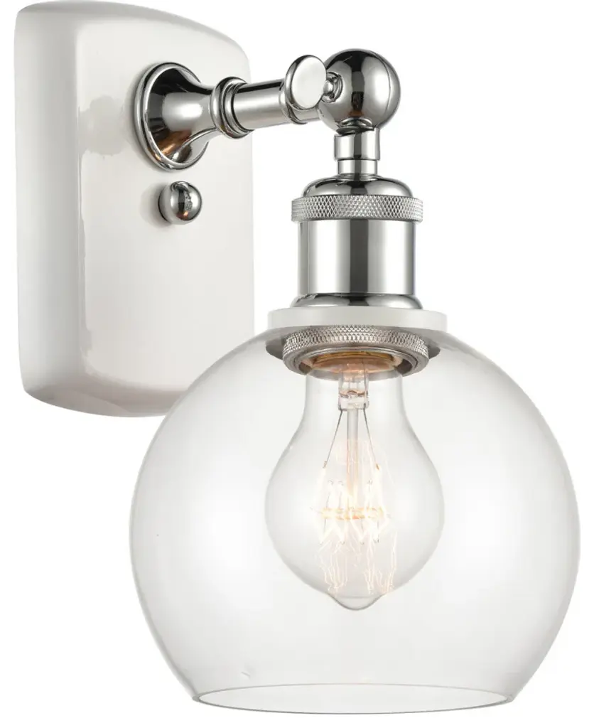 Innovations 916-1W-WPC-G202-6-LED 1-Light Sconce White and Polished Chrome. Collection: Ballston. Style: Modern Contempo, Transitional. Metal Finish: White and Polished Chrome. Metal Finish (Canopy/Backplate): White. Accent Color: Polished Chrome. Material: Steel, Cast Brass, Glass. Dimension(in): 11(H) x 6(W) x 7. 5(Ext). Bulb: (1)6W Medium Base,Dimmable(Not Included). Maximum Wattage Per Socket: 100. Voltage: 120. Color Temperature (Kelvin): 2700. CRI: 82. Lumens: 600. Glass Shade Description: Clear Beacon. Glass or Metal Shade Color: Clear. Shade Material: Glass. Glass Type: Transparent. Shade Shape: Globe. Shade Dimension(in): 6(W) x 6(H). Fitter Measurement (Glass Or Metal Shade Fitter Size): 3. 25 inch Fitter. Backplate Dimension(in): 6(H) x 4. 5(W) x 0. 75(Depth). California Proposition 65 Warning Required: Yes. UL and ETL Certification: Damp Location.