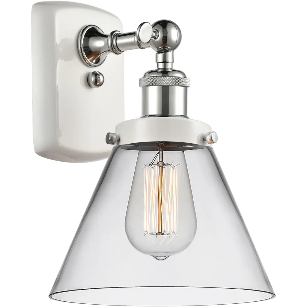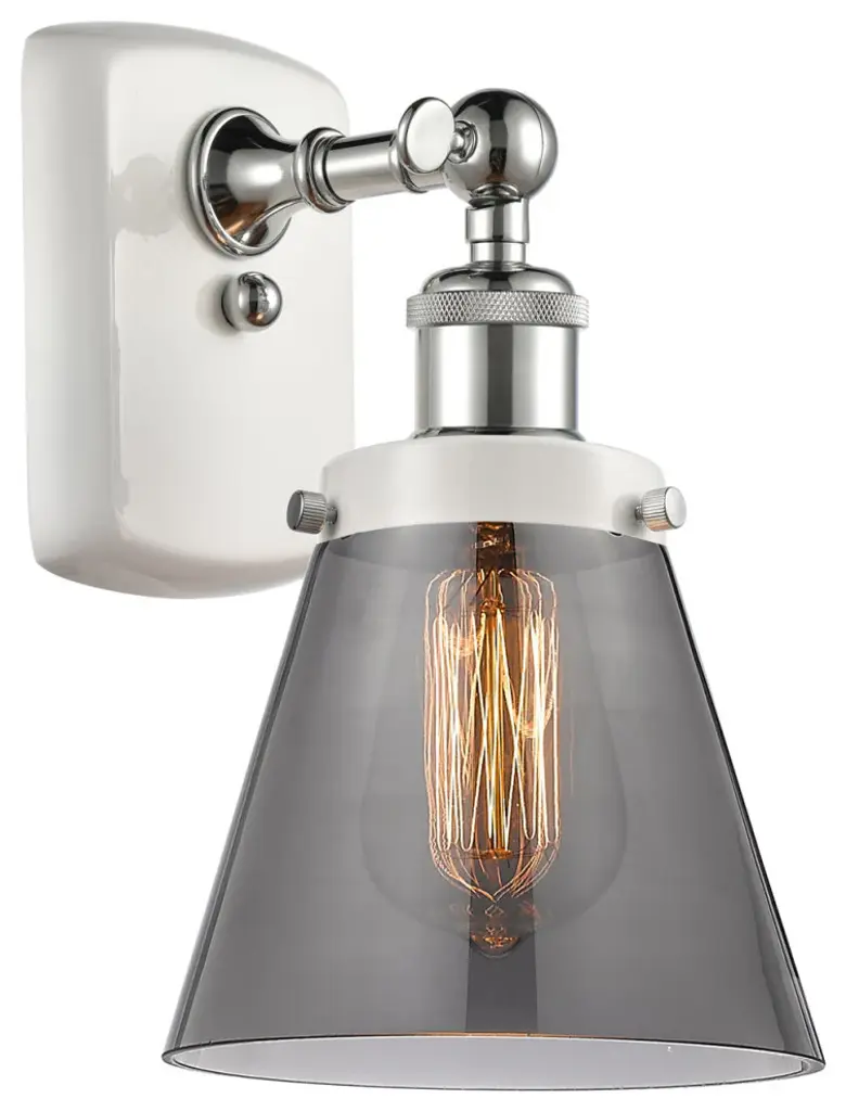 Innovations 916-1W-WPC-G43 1-Light Sconce White and Polished Chrome. Collection: Ballston. Style: Industrial, Modern Contempo, Restoration-Vintage, Transitional. Metal Finish: White and Polished Chrome. Metal Finish (Canopy/Backplate): White. Accent Color: Polished Chrome. Material: Steel, Cast Brass, Glass. Dimension(in): 13(H) x 8(W) x 9(Ext). Bulb: (1)60W Medium Base,Dimmable(Not Included). Maximum Wattage Per Socket: 100. Voltage: 120. Color Temperature (Kelvin): 2200. CRI: 99. 9. Lumens: 220. Glass Shade Description: Plated Smoke Large Cone. Glass or Metal Shade Color: Plated Smoke. Shade Material: Glass. Glass Type: Colorful. Shade Shape: Cone. Shade Dimension(in): 7. 75(W) x 6(H). Fitter Measurement (Glass Or Metal Shade Fitter Size): 3. 25 inch Fitter. Backplate Dimension(in): 6(H) x 4. 5(W) x 0. 75(Depth). ADA Compliant: No. California Proposition 65 Warning Required: Yes. UL and ETL Certification: Damp Location.