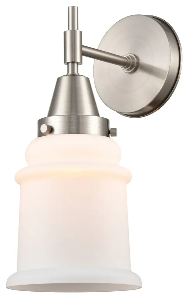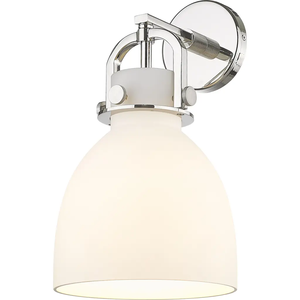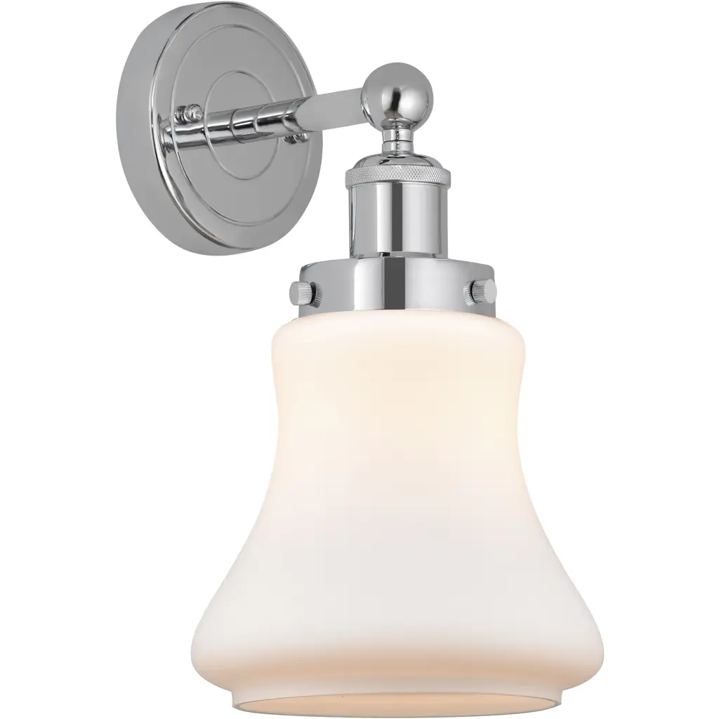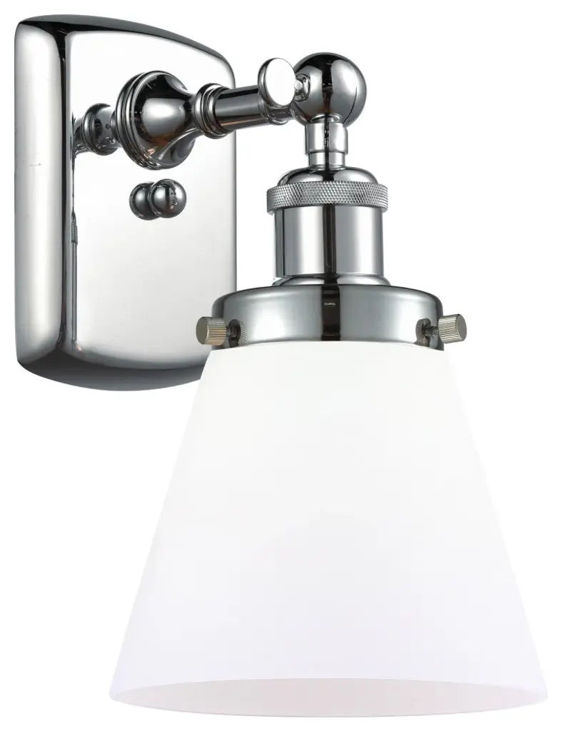 Innovations 916-1W-WPC-G51-LED 1-Light Sconce White and Polished Chrome. Collection: Ballston. Style: Industrial, Modern Contempo, Restoration-Vintage, Transitional. Metal Finish: White and Polished Chrome. Metal Finish (Canopy/Backplate): White. Accent Color: Polished Chrome. Material: Steel, Cast Brass, Glass. Dimension(in): 12(H) x 5(W) x 6. 5(Ext). Bulb: (1)6W Medium Base,Dimmable(Not Included). Maximum Wattage Per Socket: 100. Voltage: 120. Color Temperature (Kelvin): 2700. CRI: 82. Lumens: 600. Glass Shade Description: Matte White Cased Small Bell. Glass or Metal Shade Color: Matte White. Shade Material: Glass. Glass Type: Frosted. Shade Shape: Bell. Shade Dimension(in): 5(W) x 5. 75(H). Fitter Measurement (Glass Or Metal Shade Fitter Size): 3. 25 inch Fitter. Backplate Dimension(in): 6(H) x 4. 5(W) x 0. 75(Depth). California Proposition 65 Warning Required: Yes. UL and ETL Certification: Damp Location.