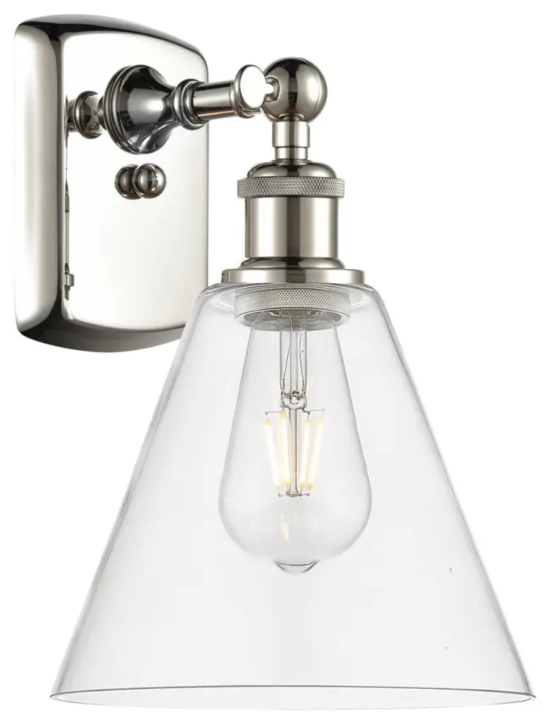 Innovations 916-1W-WPC-G62 1-Light Sconce White and Polished Chrome. Collection: Ballston. Style: Industrial, Modern Contempo, Restoration-Vintage, Transitional. Metal Finish: White and Polished Chrome. Metal Finish (Canopy/Backplate): White. Accent Color: Polished Chrome. Material: Steel, Cast Brass, Glass. Dimension(in): 11(H) x 6(W) x 7. 5(Ext). Bulb: (1)60W Medium Base,Dimmable(Not Included). Maximum Wattage Per Socket: 100. Voltage: 120. Color Temperature (Kelvin): 2200. CRI: 99. 9. Lumens: 220. Glass Shade Description: Clear Small Cone. Glass or Metal Shade Color: Clear. Shade Material: Glass. Glass Type: Transparent. Shade Shape: Cone. Shade Dimension(in): 6(W) x 6(H). Fitter Measurement (Glass Or Metal Shade Fitter Size): 3. 25 inch Fitter. Backplate Dimension(in): 6(H) x 4. 5(W) x 0. 75(Depth). ADA Compliant: No. California Proposition 65 Warning Required: Yes. UL and ETL Certification: Damp Location.