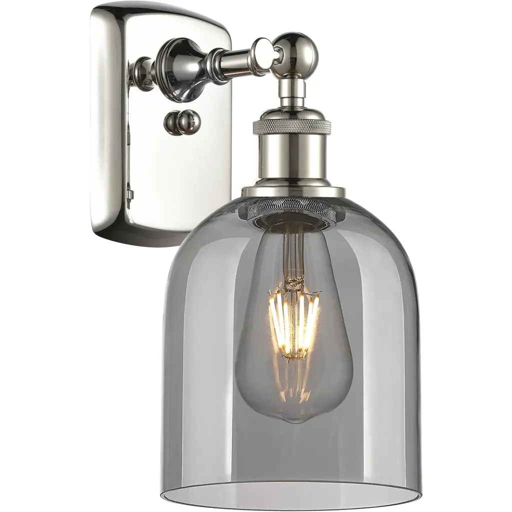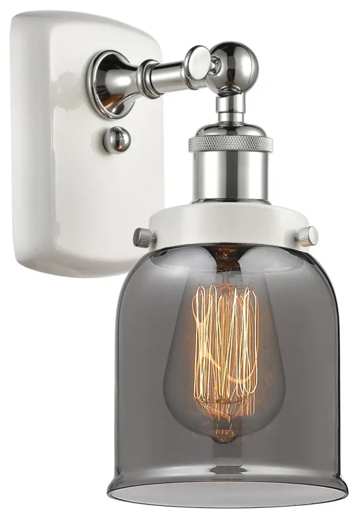 Innovations 916-1W-WPC-G73 1-Light Sconce White and Polished Chrome. Collection: Ballston. Style: Industrial, Modern Contempo, Restoration-Vintage, Transitional. Metal Finish: White and Polished Chrome. Metal Finish (Canopy/Backplate): White. Accent Color: Polished Chrome. Material: Steel, Cast Brass, Glass. Dimension(in): 13(H) x 8(W) x 9(Ext). Bulb: (1)60W Medium Base,Dimmable(Not Included). Maximum Wattage Per Socket: 100. Voltage: 120. Color Temperature (Kelvin): 2200. CRI: 99. 9. Lumens: 220. Glass Shade Description: Plated Smoke Large Bell. Glass or Metal Shade Color: Plated Smoke. Shade Material: Glass. Glass Type: Colorful. Shade Shape: Bell. Shade Dimension(in): 8(W) x 5. 75(H). Fitter Measurement (Glass Or Metal Shade Fitter Size): 3. 25 inch Fitter. Backplate Dimension(in): 6(H) x 4. 5(W) x 0. 75(Depth). ADA Compliant: No. California Proposition 65 Warning Required: Yes. UL and ETL Certification: Damp Location.