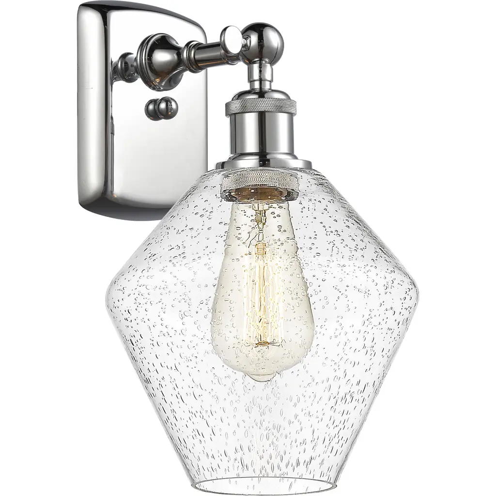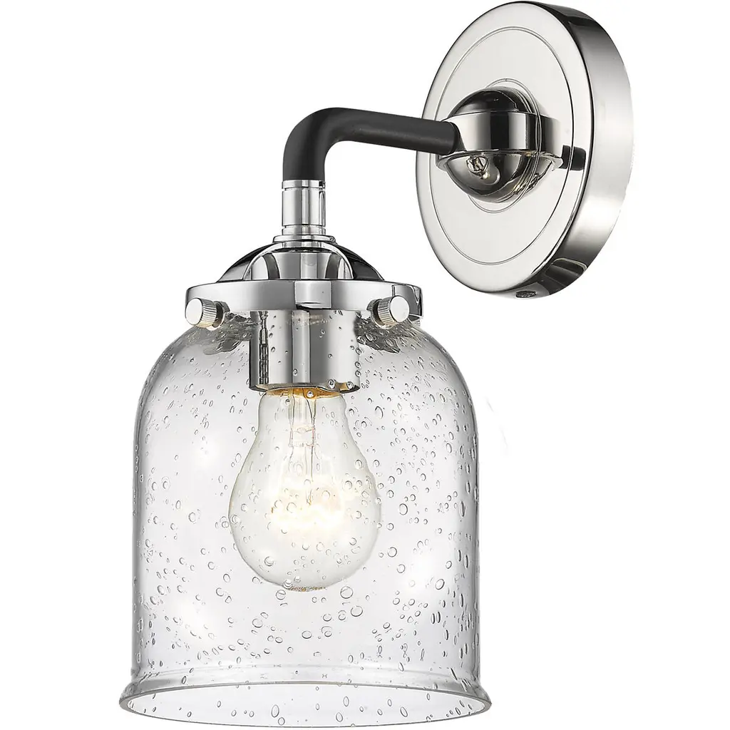 Innovations 916-1W-WPC-G74 1-Light Sconce White and Polished Chrome. Collection: Ballston. Style: Industrial, Modern Contempo, Restoration-Vintage, Transitional. Metal Finish: White and Polished Chrome. Metal Finish (Canopy/Backplate): White. Accent Color: Polished Chrome. Material: Steel, Cast Brass, Glass. Dimension(in): 13(H) x 8(W) x 9(Ext). Bulb: (1)60W Medium Base,Dimmable(Not Included). Maximum Wattage Per Socket: 100. Voltage: 120. Color Temperature (Kelvin): 2200. CRI: 99. 9. Lumens: 220. Glass Shade Description: Seedy Large Bell. Glass or Metal Shade Color: Seedy. Shade Material: Glass. Glass Type: Seeded. Shade Shape: Bell. Shade Dimension(in): 8(W) x 5. 75(H). Fitter Measurement (Glass Or Metal Shade Fitter Size): 3. 25 inch Fitter. Backplate Dimension(in): 6(H) x 4. 5(W) x 0. 75(Depth). ADA Compliant: No. California Proposition 65 Warning Required: Yes. UL and ETL Certification: Damp Location.