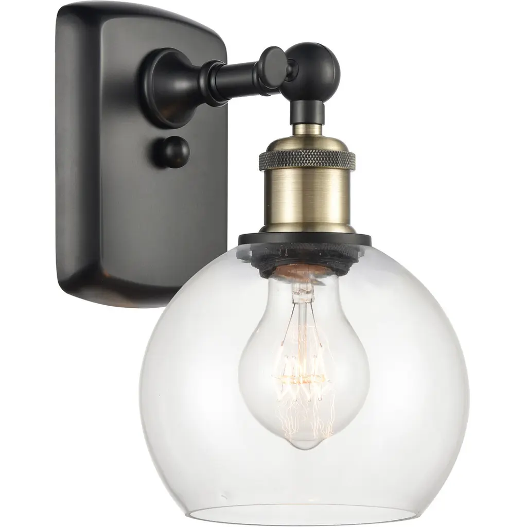 Innovations 918-1W-BAB-G202-6-LED Beacon 1 Light 6 inch Sconce Black Antique Brass. Collection: Franklin Restoration. Style: Industrial, Restoration-Vintage, Traditional. Metal Finish: Black Antique Brass. Metal Finish(Canopy/Backplate): Black Antique Brass. Material: Steel, Cast Brass, Glass. Dimensions(in): 12.5(H) x 6(W) x 13(Ext). Bulb: (1)6W LED(Included). Maximum Wattage Per Socket: 100. Voltage: 120. Dimmable: Yes. Color Temperature (Kelvin): 2700. Color Rendering Index (CRI): 82. Lumens: 600. Life Expectancy (Hours): 15000. Glass Shade Description: Clear Beacon. Glass Type: Transparent. Shade Shape: Globe/Orb. Glass or Metal Shade Color: Clear. Shade Material: Glass. Shade Dimensions(in): 6(W) x 5.75(H). Fitter Measurement (Glass or Metal Shade Fitter Size): 3.25 inch Fitter. Canopy Dimensions(in): 4.5(Dia). Backplate Dimenisons(in): 7.875(H) x 4.5(W) x 0.75(Depth). Mounting Center to Top: 7.0625. ADA Compliant: No. Reversible (Can be hung with bulbs facing uo or down): Yes. Duo Mount: Yes. California Proposition 65 Warning Required: Yes. UL and ETL Certification: Damp Location.