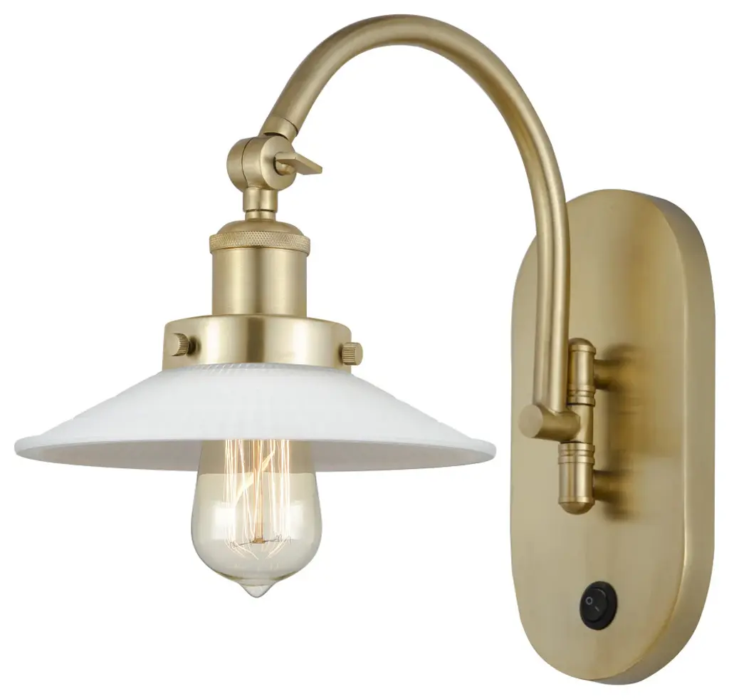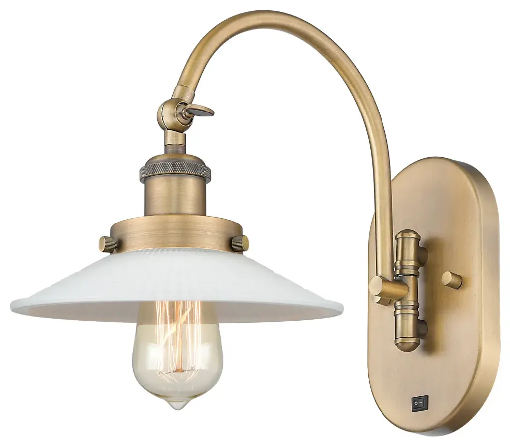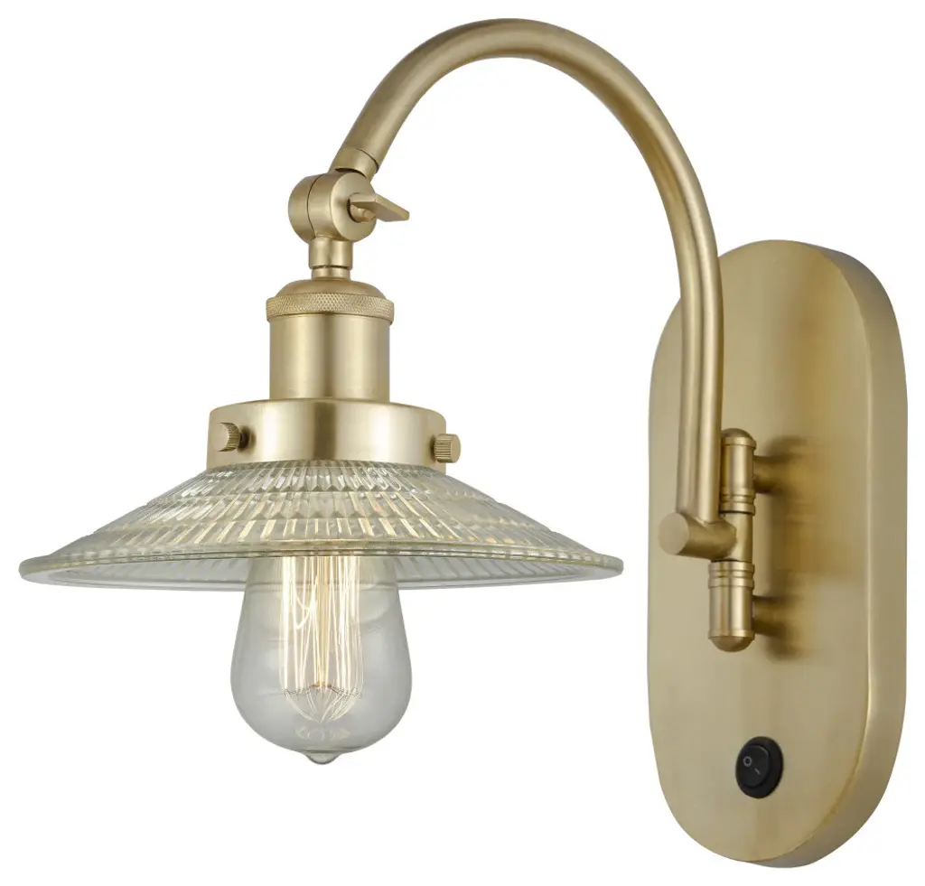 Innovations 918-1W-BB-G2 1-Light Sconce Brushed Brass. Collection: Franklin Restoration. Style: Industrial, Restoration-Vintage, Traditional. Metal Finish: Brushed Brass. Metal Finish (Canopy/Backplate): Brushed Brass. Material: Steel, Cast Brass, Glass. Dimension(in): 11(H) x 8. 5(W) x 14. 5(Ext). Bulb: (1)60W Medium Base,Dimmable(Not Included). Maximum Wattage Per Socket: 100. Voltage: 120. Color Temperature (Kelvin): 2200. CRI: 99. 9. Lumens: 220. Glass Shade Description: Clear Halophane. Glass or Metal Shade Color: Clear Halophane. Shade Material: Glass. Glass Type: Transparent. Shade Shape: Cone. Shade Dimension(in): 9(W) x 2(H). Fitter Measurement (Glass Or Metal Shade Fitter Size): 3. 25 inch Fitter. Canopy Dimension(in): 4. 5(Dia). Backplate Dimension(in): 4. 5(Dia) x 0. 75(Depth). California Proposition 65 Warning Required: Yes. UL and ETL Certification: Damp Location.