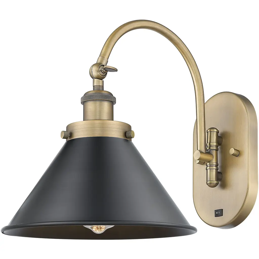 Innovations 918-1W-BB-M10-BK-LED Briarcliff 1 Light 10 inch Sconce Brushed Brass. Collection: Franklin Restoration. Style: Traditional, Industrial, Restoration-Vintage. Metal Finish: Brushed Brass. Metal Finish(Shade): Matte Black. Metal Finish(Canopy/Backplate): Brushed Brass. Material: Steel, Cast Brass. Dimensions(in): 12.25(H) x 10(W) x 15(Ext). Bulb: (1)6W LED(Included). Maximum Wattage Per Socket: 100. Voltage: 120. Dimmable: Yes. Color Temperature (Kelvin): 2700. Color Rendering Index (CRI): 82. Lumens: 600. Life Expectancy (Hours): 15000. Shade Shape: Cone. Glass or Metal Shade Color: Brushed Brass. Shade Material: Metal. Metal Shade Description: Brushed Brass Briarcliff. Shade Dimensions(in): 10(W) x 5.5(H). Fitter Measurement (Glass or Metal Shade Fitter Size): 3.25 inch Fitter. Canopy Dimensions(in): 4.5(Dia). Backplate Dimenisons(in): 7.875(H) x 4.5(W) x 0.75(Depth). Mounting Center to Top: 7.0625. ADA Compliant: No. Reversible (Can be hung with bulbs facing uo or down): Yes. Duo Mount: Yes. California Proposition 65 Warning Required: Yes. UL and ETL Certification: Damp Location.