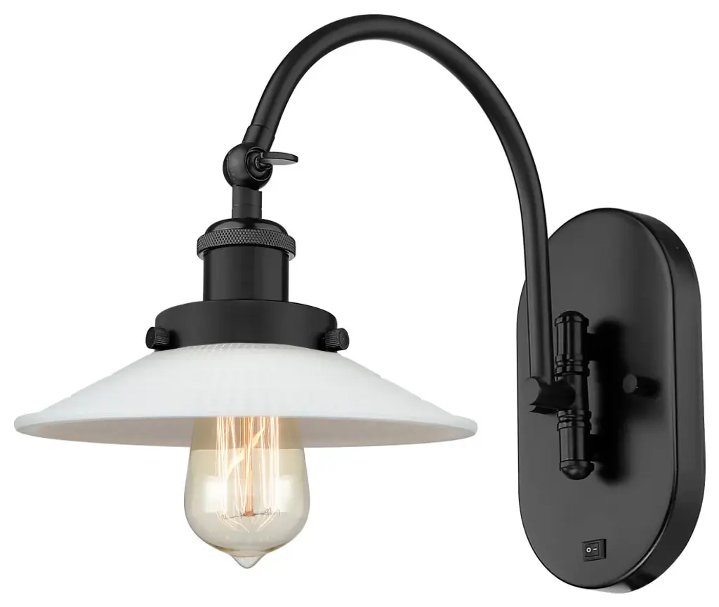 Innovations 918-1W-BK-G2-LED 1-Light Sconce Matte Black. Collection: Franklin Restoration. Style: Industrial, Restoration-Vintage, Traditional. Metal Finish: Matte Black. Metal Finish (Canopy/Backplate): Matte Black. Material: Steel, Cast Brass, Glass. Dimension(in): 11(H) x 8. 5(W) x 14. 5(Ext). Bulb: (1)6W Medium Base,Dimmable(Not Included). Maximum Wattage Per Socket: 100. Voltage: 120. Color Temperature (Kelvin): 2700. CRI: 82. Lumens: 600. Glass Shade Description: Clear Halophane. Glass or Metal Shade Color: Clear Halophane. Shade Material: Glass. Glass Type: Transparent. Shade Shape: Cone. Shade Dimension(in): 9(W) x 2(H). Fitter Measurement (Glass Or Metal Shade Fitter Size): 3. 25 inch Fitter. Canopy Dimension(in): 4. 5(Dia). Backplate Dimension(in): 4. 5(Dia) x 0. 75(Depth). California Proposition 65 Warning Required: Yes. UL and ETL Certification: Damp Location.
