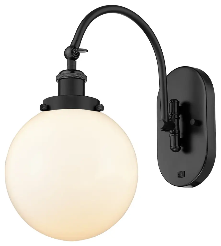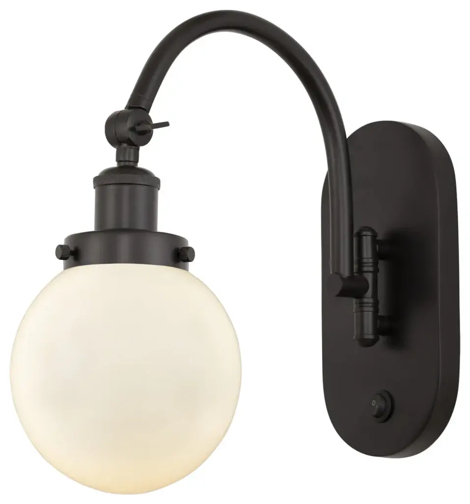 Innovations 918-1W-BK-G201-6 1-Light Sconce Matte Black. Collection: Franklin Restoration. Style: Industrial, Restoration-Vintage, Traditional. Metal Finish: Matte Black. Metal Finish (Canopy/Backplate): Matte Black. Material: Steel, Cast Brass, Glass. Dimension(in): 12. 5(H) x 6(W) x 13(Ext). Bulb: (1)60W Medium Base,Dimmable(Not Included). Maximum Wattage Per Socket: 100. Voltage: 120. Color Temperature (Kelvin): 2200. CRI: 99. 9. Lumens: 220. Glass Shade Description: Matte White Cased Beacon. Glass or Metal Shade Color: Matte White. Shade Material: Glass. Glass Type: Frosted. Shade Shape: Globe. Shade Dimension(in): 6(W) x 5. 75(H). Fitter Measurement (Glass Or Metal Shade Fitter Size): 3. 25 inch Fitter. Canopy Dimension(in): 4. 5(Dia). Backplate Dimension(in): 4. 5(Dia) x 0. 75(Depth). California Proposition 65 Warning Required: Yes. UL and ETL Certification: Damp Location.