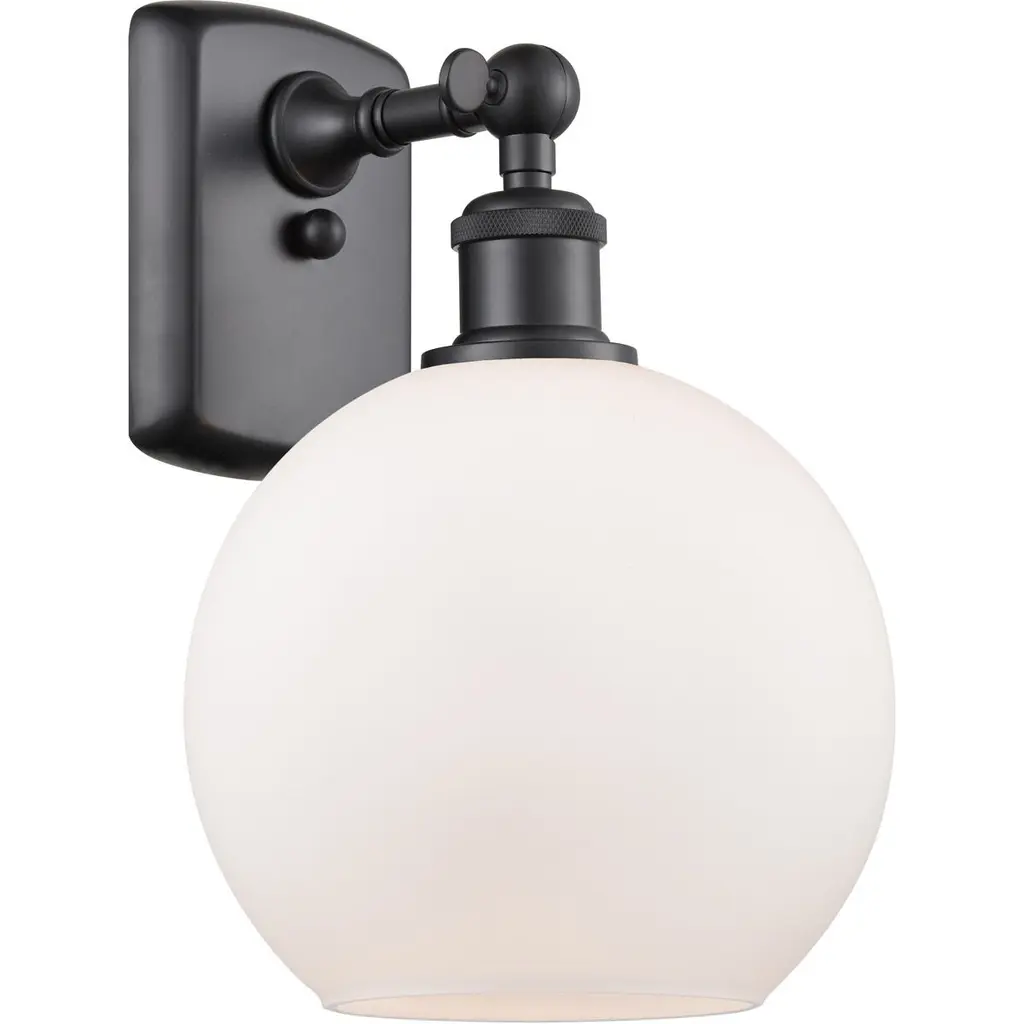 Innovations 918-1W-OB-G201-8 1-Light Sconce Oil Rubbed Bronze. Collection: Franklin Restoration. Style: Industrial, Restoration-Vintage, Traditional. Metal Finish: Oil Rubbed Bronze. Metal Finish (Canopy/Backplate): Oil Rubbed Bronze. Material: Steel, Cast Brass, Glass. Dimension(in): 14. 5(H) x 8(W) x 14(Ext). Bulb: (1)60W Medium Base,Dimmable(Not Included). Maximum Wattage Per Socket: 100. Voltage: 120. Color Temperature (Kelvin): 2200. CRI: 99. 9. Lumens: 220. Glass Shade Description: Matte White Cased Beacon. Glass or Metal Shade Color: Matte White. Shade Material: Glass. Glass Type: Frosted. Shade Shape: Globe. Shade Dimension(in): 8(W) x 7. 75(H). Fitter Measurement (Glass Or Metal Shade Fitter Size): 3. 25 inch Fitter. Canopy Dimension(in): 4. 5(Dia). Backplate Dimension(in): 4. 5(Dia) x 0. 75(Depth). California Proposition 65 Warning Required: Yes. UL and ETL Certification: Damp Location.
