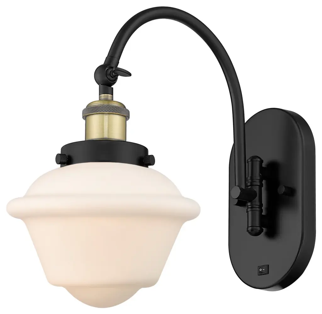 Innovations 918-1W-OB-G531 1-Light Sconce Oil Rubbed Bronze. Collection: Franklin Restoration. Style: Traditional. Metal Finish: Oil Rubbed Bronze. Metal Finish (Canopy/Backplate): Oil Rubbed Bronze. Material: Steel, Cast Brass, Glass. Dimension(in): 12. 5(H) x 7. 5(W) x 13. 75(Ext). Bulb: (1)60W Medium Base,Dimmable(Not Included). Maximum Wattage Per Socket: 100. Voltage: 120. Color Temperature (Kelvin): 2200. CRI: 99. 9. Lumens: 220. Glass Shade Description: Matte White Cased Small Oxford. Glass or Metal Shade Color: Matte White. Shade Material: Glass. Glass Type: Frosted. Shade Shape: Schoolhouse. Shade Dimension(in): 7. 5(W) x 5. 75(H). Fitter Measurement (Glass Or Metal Shade Fitter Size): 3. 25 inch Fitter. Canopy Dimension(in): 4. 5(Dia). Backplate Dimension(in): 4. 5(Dia) x 0. 75(Depth). California Proposition 65 Warning Required: Yes. UL and ETL Certification: Damp Location.