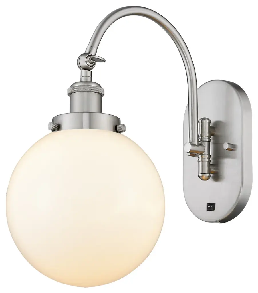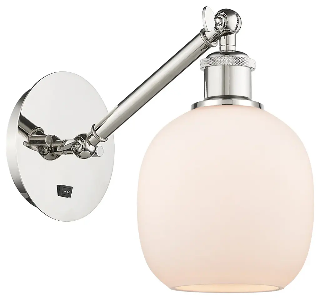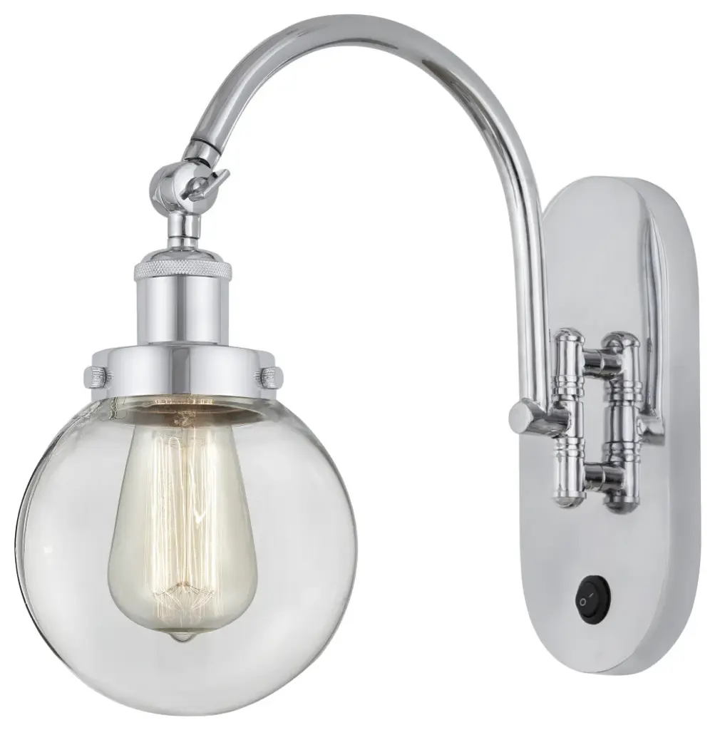 Innovations 918-1W-PC-G201-6 1-Light Sconce Polished Chrome. Collection: Franklin Restoration. Style: Industrial, Restoration-Vintage, Traditional. Metal Finish: Polished Chrome. Metal Finish (Canopy/Backplate): Polished Chrome. Material: Steel, Cast Brass, Glass. Dimension(in): 12. 5(H) x 6(W) x 13(Ext). Bulb: (1)60W Medium Base,Dimmable(Not Included). Maximum Wattage Per Socket: 100. Voltage: 120. Color Temperature (Kelvin): 2200. CRI: 99. 9. Lumens: 220. Glass Shade Description: Matte White Cased Beacon. Glass or Metal Shade Color: Matte White. Shade Material: Glass. Glass Type: Frosted. Shade Shape: Globe. Shade Dimension(in): 6(W) x 5. 75(H). Fitter Measurement (Glass Or Metal Shade Fitter Size): 3. 25 inch Fitter. Canopy Dimension(in): 4. 5(Dia). Backplate Dimension(in): 4. 5(Dia) x 0. 75(Depth). California Proposition 65 Warning Required: Yes. UL and ETL Certification: Damp Location.