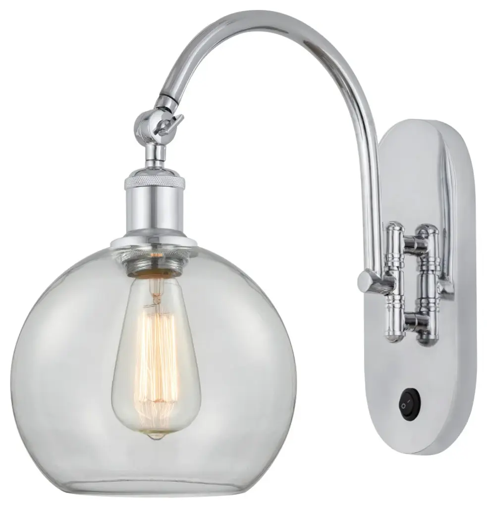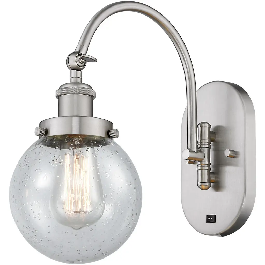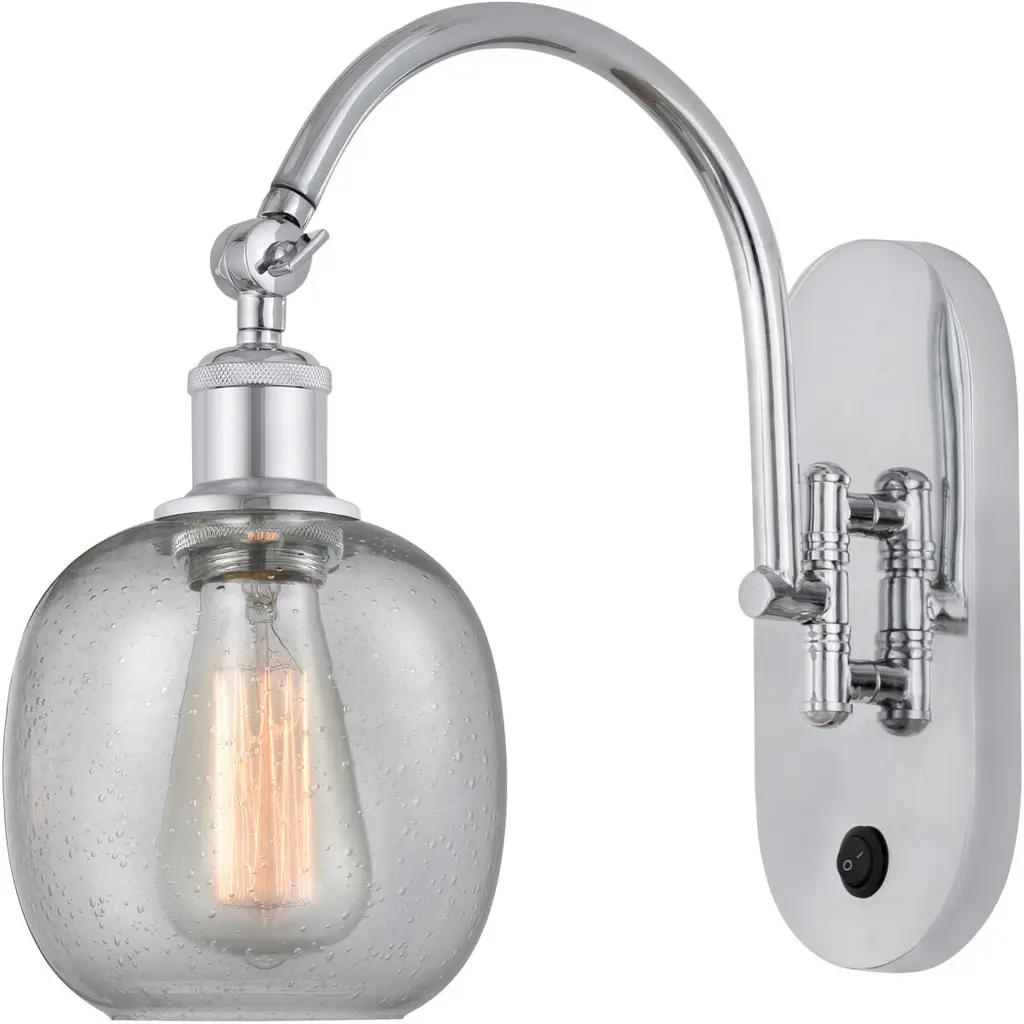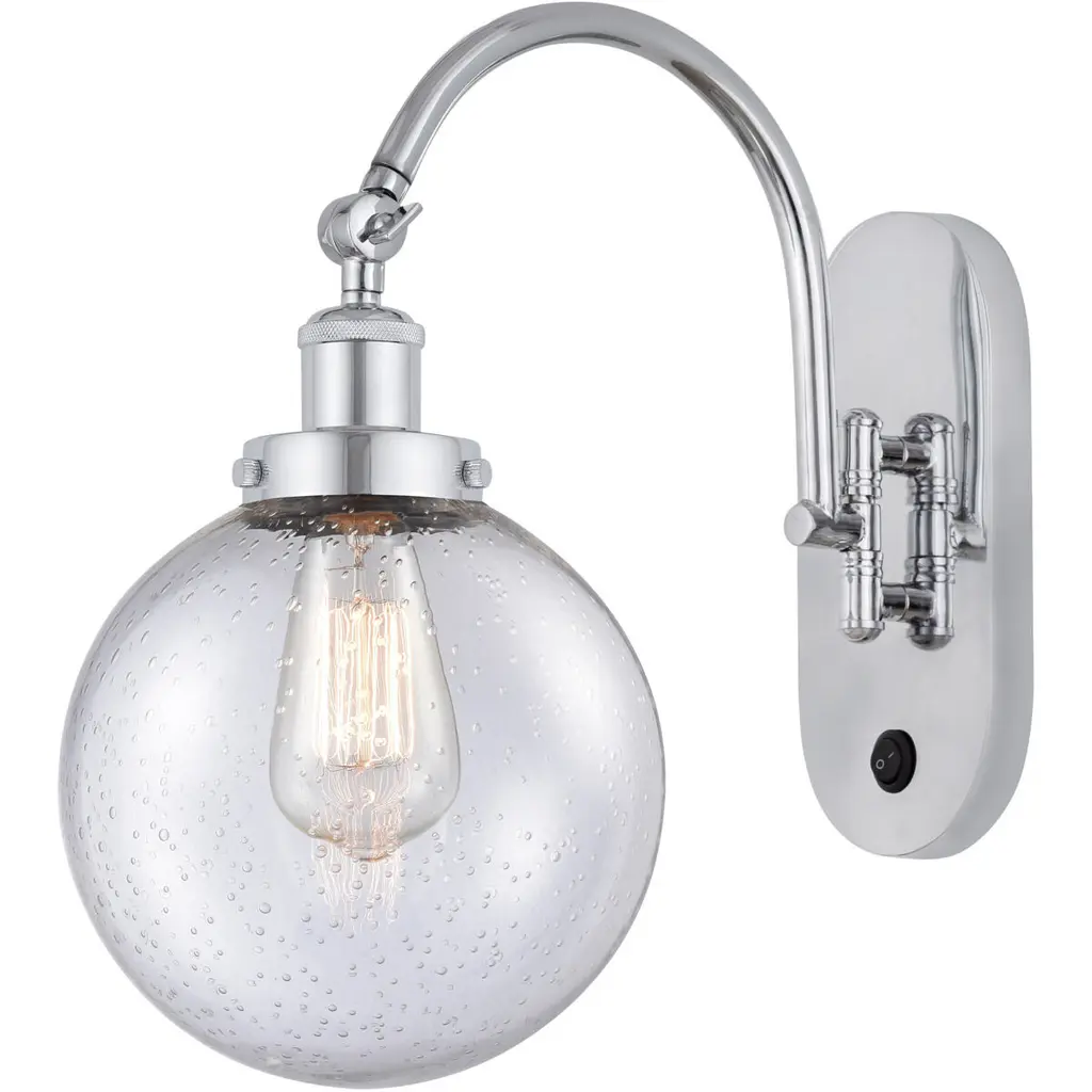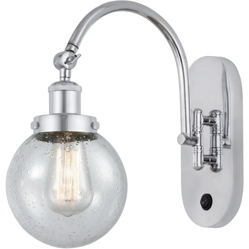 Innovations 918-1W-PC-G204-6 1-Light Sconce Polished Chrome. Collection: Franklin Restoration. Style: Industrial, Restoration-Vintage, Traditional. Metal Finish: Polished Chrome. Metal Finish (Canopy/Backplate): Polished Chrome. Material: Steel, Cast Brass, Glass. Dimension(in): 12. 5(H) x 6(W) x 13(Ext). Bulb: (1)60W Medium Base,Dimmable(Not Included). Maximum Wattage Per Socket: 100. Voltage: 120. Color Temperature (Kelvin): 2200. CRI: 99. 9. Lumens: 220. Glass Shade Description: Seedy Beacon. Glass or Metal Shade Color: Seedy. Shade Material: Glass. Glass Type: Seeded. Shade Shape: Sphere. Shade Dimension(in): 6(W) x 5. 75(H). Fitter Measurement (Glass Or Metal Shade Fitter Size): 3. 25 inch Fitter. Canopy Dimension(in): 4. 5(Dia). Backplate Dimension(in): 4. 5(Dia) x 0. 75(Depth). California Proposition 65 Warning Required: Yes. UL and ETL Certification: Damp Location.