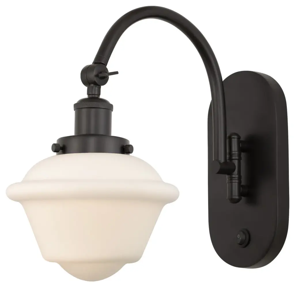 Innovations 918-1W-PC-G531 1-Light Sconce Polished Chrome. Collection: Franklin Restoration. Style: Traditional. Metal Finish: Polished Chrome. Metal Finish (Canopy/Backplate): Polished Chrome. Material: Steel, Cast Brass, Glass. Dimension(in): 12. 5(H) x 7. 5(W) x 13. 75(Ext). Bulb: (1)60W Medium Base,Dimmable(Not Included). Maximum Wattage Per Socket: 100. Voltage: 120. Color Temperature (Kelvin): 2200. CRI: 99. 9. Lumens: 220. Glass Shade Description: Matte White Cased Small Oxford. Glass or Metal Shade Color: Matte White. Shade Material: Glass. Glass Type: Frosted. Shade Shape: Schoolhouse. Shade Dimension(in): 7. 5(W) x 5. 75(H). Fitter Measurement (Glass Or Metal Shade Fitter Size): 3. 25 inch Fitter. Canopy Dimension(in): 4. 5(Dia). Backplate Dimension(in): 4. 5(Dia) x 0. 75(Depth). California Proposition 65 Warning Required: Yes. UL and ETL Certification: Damp Location.