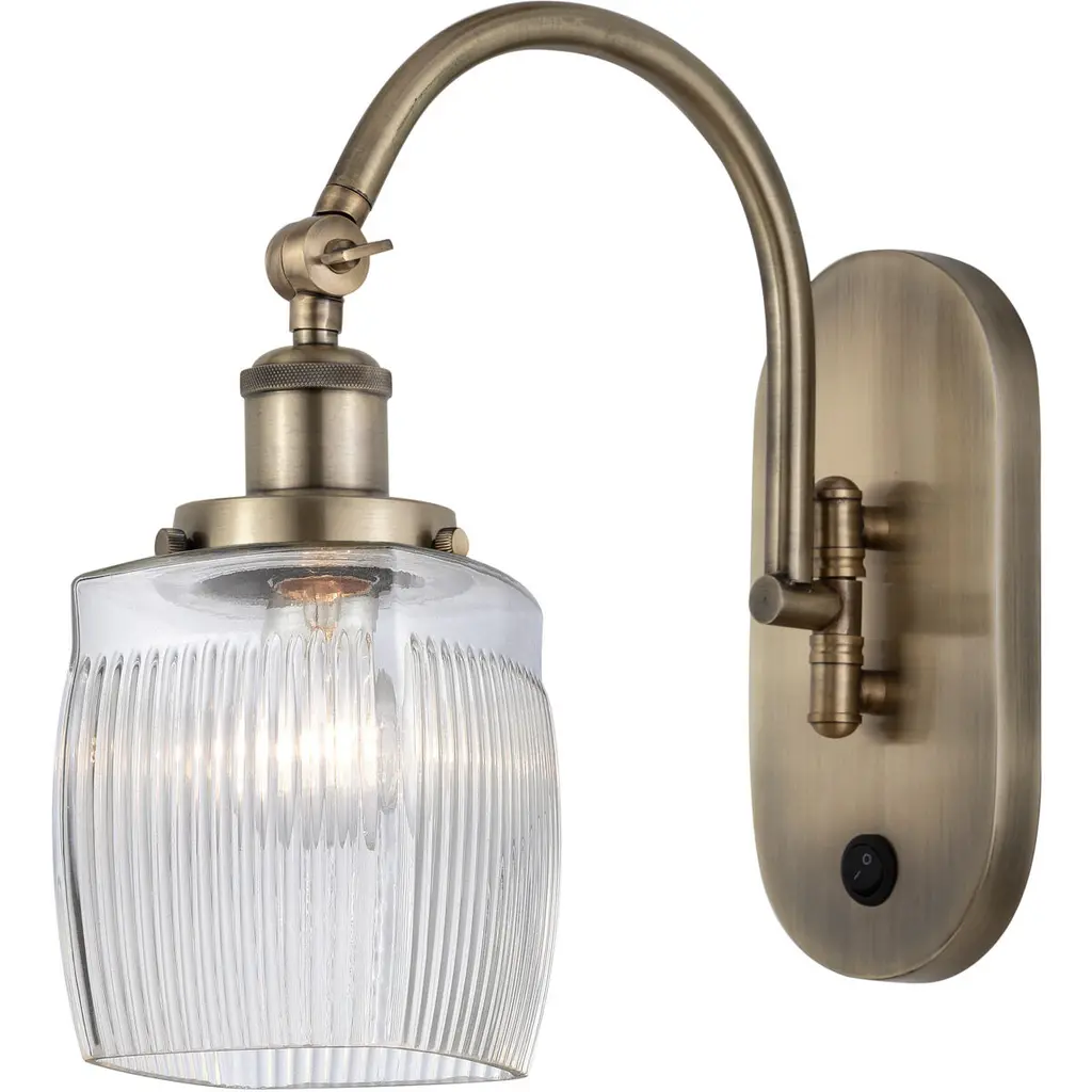 Innovations 918-1W-SG-G302-LED Colton 1 Light 5.5 inch Sconce Satin Gold. Collection: Franklin Restoration. Style: Traditional. Metal Finish: Satin Gold. Metal Finish(Canopy/Backplate): Satin Gold. Material: Steel, Cast Brass, Glass. Dimensions(in): 12.75(H) x 5.5(W) x 12.75(Ext). Bulb: (1)6W LED(Included). Maximum Wattage Per Socket: 100. Voltage: 120. Dimmable: Yes. Color Temperature (Kelvin): 2700. Color Rendering Index (CRI): 82. Lumens: 600. Life Expectancy (Hours): 15000. Glass Shade Description: Thick Clear Halophane Colton. Glass Type: Transparent; Ribbed. Shade Shape: Square/Rectangle. Glass or Metal Shade Color: Clear Halophane. Shade Material: Glass. Shade Dimensions(in): 5.5(W) x 6(H). Fitter Measurement (Glass or Metal Shade Fitter Size): 3.25 inch Fitter. Canopy Dimensions(in): 4.5(Dia). Backplate Dimenisons(in): 7.875(H) x 4.5(W) x 0.75(Depth). Mounting Center to Top: 7.0625. ADA Compliant: No. Reversible (Can be hung with bulbs facing uo or down): Yes. Duo Mount: Yes. California Proposition 65 Warning Required: Yes. UL and ETL Certification: Damp Location.