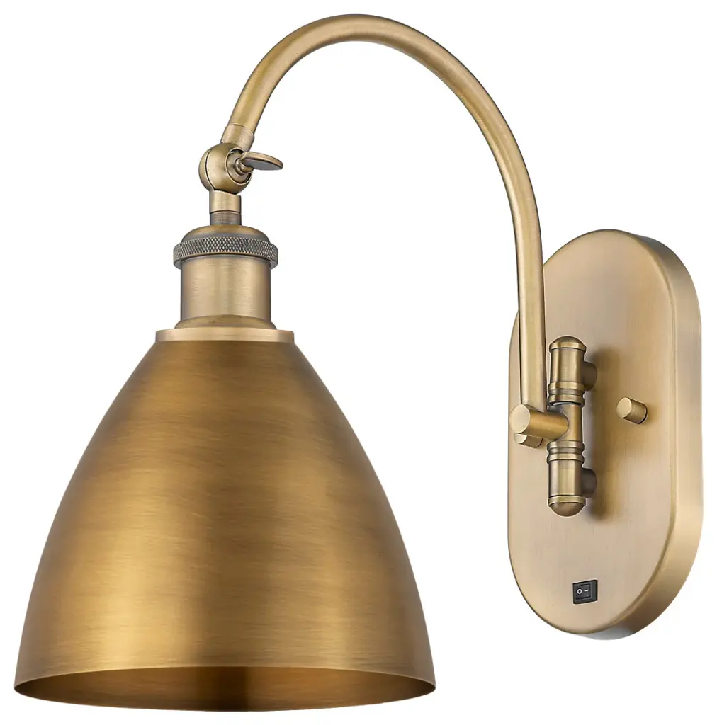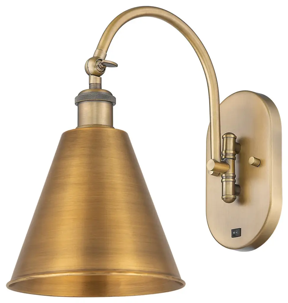 Innovations 918-1W-SG-M13-SG Appalachian 1 Light 8 inch Sconce Satin Gold. Collection: Franklin Restoration. Style: Traditional, Industrial, Restoration-Vintage. Metal Finish: Satin Gold. Metal Finish(Shade): Satin Gold. Metal Finish(Canopy/Backplate): Satin Gold. Material: Steel, Cast Brass. Dimensions(in): 12.875(H) x 8(W) x 14(Ext). Bulb: (1)60W Medium Base Incandescent(Not Included). Maximum Wattage Per Socket: 100. Voltage: 120. Dimmable: Yes. Color Temperature (Kelvin): 2200. Color Rendering Index (CRI): 99.9. Lumens: 220. Life Expectancy (Hours): 2000. Shade Shape: Cone. Glass or Metal Shade Color: Satin Gold. Shade Material: Metal. Metal Shade Description: Satin Gold Appalachian. Shade Dimensions(in): 8(W) x 6.125(H). Fitter Measurement (Glass or Metal Shade Fitter Size): 3.25 inch Fitter. Canopy Dimensions(in): 4.5(Dia). Backplate Dimenisons(in): 7.875(H) x 4.5(W) x 0.75(Depth). Mounting Center to Top: 7.0625. ADA Compliant: No. Reversible (Can be hung with bulbs facing uo or down): Yes. Duo Mount: Yes. California Proposition 65 Warning Required: Yes. UL and ETL Certification: Damp Location.
