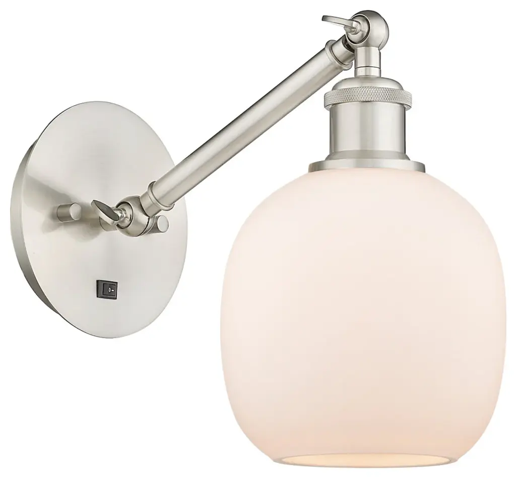 Innovations 918-1W-SN-G201-8 Beacon 1 Light 8 inch Sconce Brushed Satin Nickel. Collection: Franklin Restoration. Style: Industrial, Restoration-Vintage, Traditional. Metal Finish: Brushed Satin Nickel. Metal Finish(Canopy/Backplate): Brushed Satin Nickel. Material: Steel, Cast Brass, Glass. Dimensions(in): 14.5(H) x 8(W) x 14(Ext). Bulb: (1)60W Medium Base Incandescent(Not Included). Maximum Wattage Per Socket: 100. Voltage: 120. Dimmable: Yes. Color Temperature (Kelvin): 2200. Color Rendering Index (CRI): 99.9. Lumens: 220. Life Expectancy (Hours): 2000. Glass Shade Description: Matte White Cased Beacon. Glass Type: Frosted. Shade Shape: Globe/Orb. Glass or Metal Shade Color: Matte White. Shade Material: Glass. Shade Dimensions(in): 8(W) x 7.75(H). Fitter Measurement (Glass or Metal Shade Fitter Size): 3.25 inch Fitter. Canopy Dimensions(in): 4.5(Dia). Backplate Dimenisons(in): 7.875(H) x 4.5(W) x 0.75(Depth). Mounting Center to Top: 7.0625. ADA Compliant: No. Reversible (Can be hung with bulbs facing uo or down): Yes. Duo Mount: Yes. California Proposition 65 Warning Required: Yes. UL and ETL Certification: Damp Location.