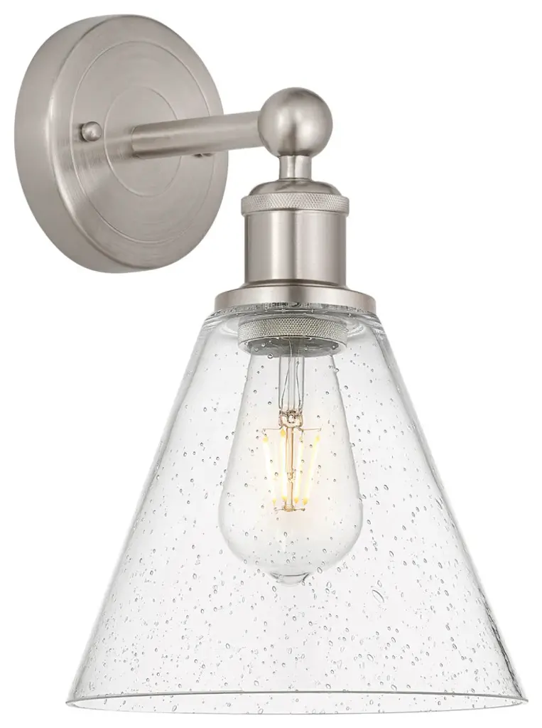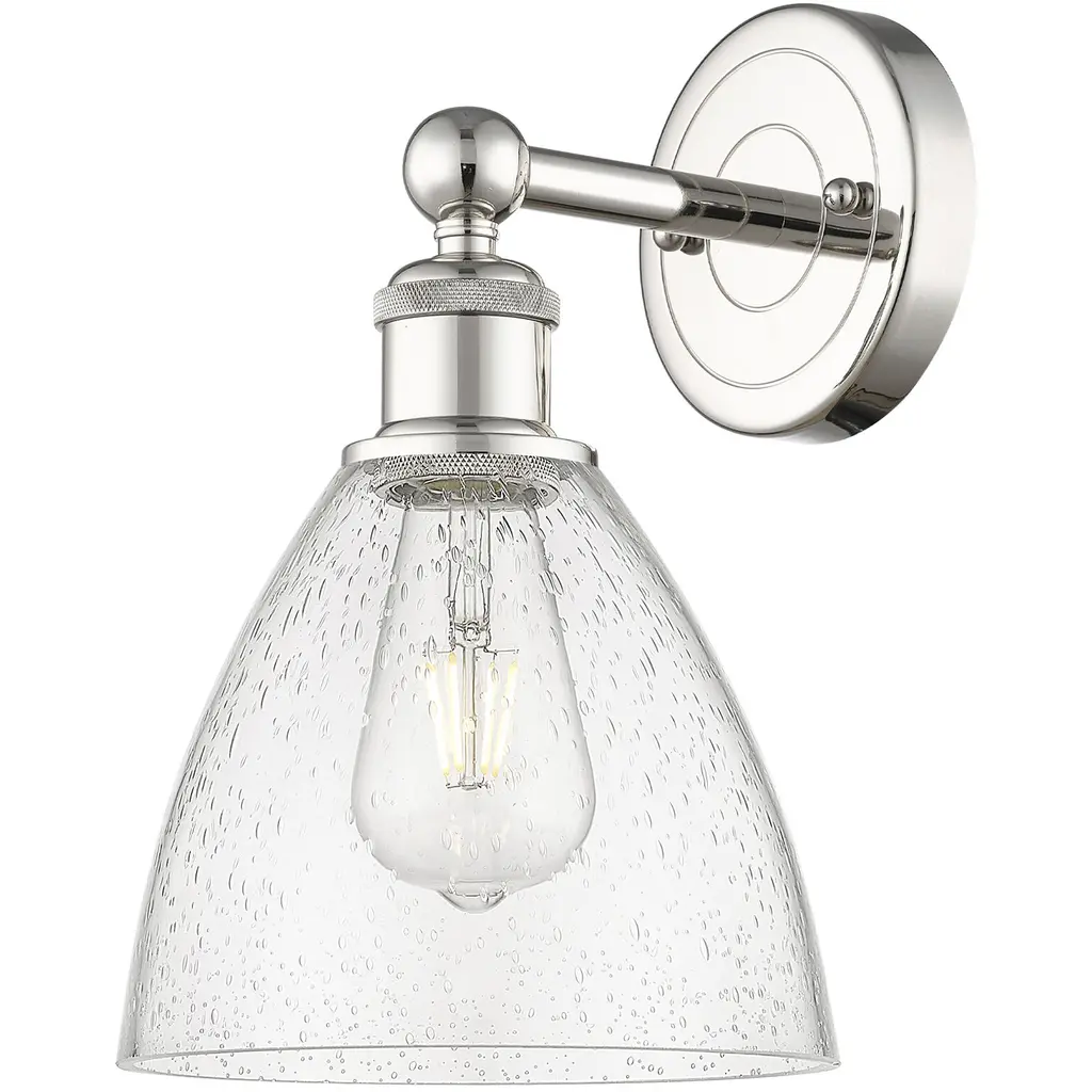 INNOVATIONS 616-1W-PN-G194 Bellmont 1 6.5 inch Sconce Polished Nickel. Style: Art Nouveau, Industrial, Restoration-Vintage, Transitional . Collection Name: Edison. Metal Finish(Body): Polished Nickel. Metal Finish(Canopy/Backplate): Polished Nickel. Material: Steel, Cast Brass, Glass. Dimension(in): 11.5(H) x 6.125(W) x 7.5625(Ext). Bulb: (1)60W Medium Base Incandescent(Not Included). Voltage: 120. Dimmable: Yes. Color Temperature (Kelvin): 2200. Color Rendering Index (CRI): 99.9. Lumens: 220. Life Expectancy (Hours): 2000. Glass Shade Description: Seedy Bellmont. Glass Type: Seedy; Ribbed. Shade Shape: Bowl. Glass or Metal Shade Color: Seedy. Shade Material: Glass. Shade Dimension(in): 6.125(W) x 6.25(H). Fitter Measurement (Glass Or Metal Shade Fitter Size): 3.25 inch Fitter. Backplate Dimension(in): 4.5(W) x 0.75(Depth). ADA Compliant: No. California Proposition 65 Warning Required: Yes. UL/ETL Certification Type: Damp Location.
