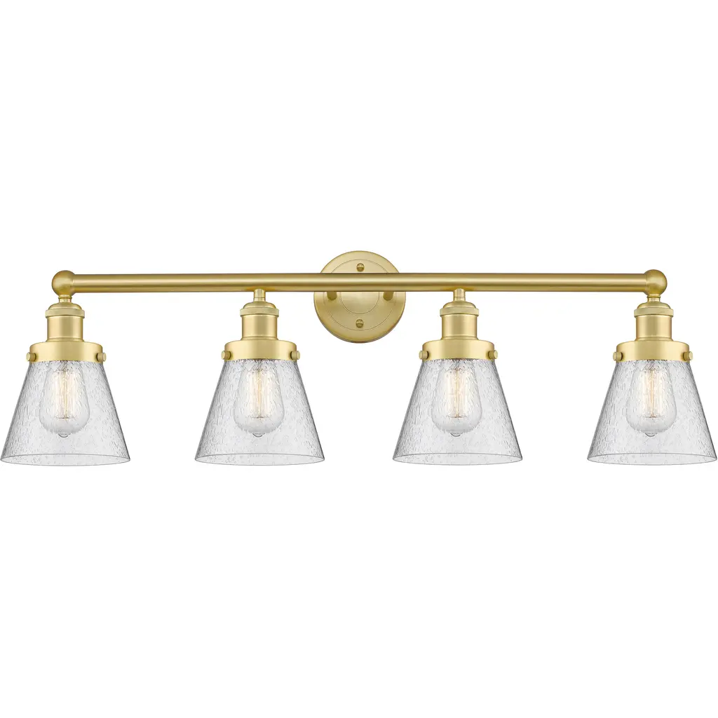 INNOVATIONS 616-4W-BB-G192 Bellmont 4 33.5 inch Bath Vanity Light Brushed Brass. Style: Art Nouveau, Industrial, Restoration-Vintage, Transitional . Collection Name: Edison. Metal Finish(Body): Brushed Brass. Metal Finish(Canopy/Backplate): Brushed Brass. Material: Steel, Cast Brass, Glass. Dimension(in): 11.5(H) x 33.125(W) x 7.5625(Ext). Bulb: (4)60W Medium Base Incandescent(Not Included). Voltage: 120. Dimmable: Yes. Color Temperature (Kelvin): 2200. Color Rendering Index (CRI): 99.9. Lumens: 220. Life Expectancy (Hours): 2000. Glass Shade Description: Clear Bellmont. Glass Type: Transparent; Ribbed. Shade Shape: Bowl. Glass or Metal Shade Color: Clear. Shade Material: Glass. Shade Dimension(in): 6.125(W) x 6.25(H). Fitter Measurement (Glass Or Metal Shade Fitter Size): 3.25 inch Fitter. Backplate Dimension(in): 4.5(W) x 0.75(Depth). ADA Compliant: No. California Proposition 65 Warning Required: Yes. UL/ETL Certification Type: Damp Location.