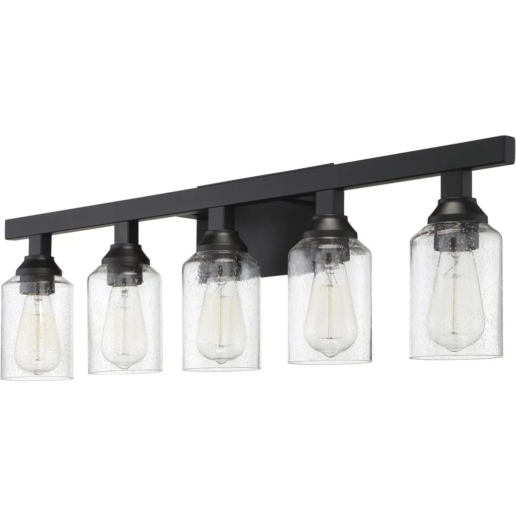 INNOVATIONS 428-4W-BK-G428-7SDY Bolivar 4 31 inch Bath Vanity Light Matte Black. Style: Industrial, Restoration, Transitional. Collection Name: Downtown Urban. Metal Finish(Body): Matte Black. Material: Steel, Cast Brass, Glass. Dimension(in): 9.5(H) x 31(W) x 6(Ext). Bulb: (4)5W LED(Included). Voltage: 120. Dimmable: Yes. Color Temperature (Kelvin): 2700. Color Rendering Index (CRI): 90. Lumens: 500. Life Expectancy (Hours): 15000. Glass Shade Description: Seedy Bolivar. Glass Type: Seedy. Shade Shape: Cylinder. Glass or Metal Shade Color: Seedy. Shade Material: Glass. Shade Dimension(in): 3.5(W) x 6.75(H). ADA Compliant: No. California Proposition 65 Warning Required: Yes. UL/ETL Certification Type: Damp Location.