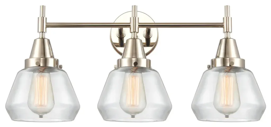 INNOVATIONS 447-3W-BB-G172 Caden 3 Light 25 inch Bath Vanity Light Brushed Brass. Style: Retro, Industrial. Collection Name: Caden. Metal Finish(Body): Brushed Brass. Metal Finish(Canopy/Backplate): Brushed Brass. Material: Steel, Glass. Dimension(in): 10.5(H) x 24.75(W) x 8.625(Ext). Bulb: (3)60W Medium Base Incandescent(Not Included). Voltage: 120. Dimmable: Yes. Color Temperature (Kelvin): 2200. Color Rendering Index (CRI): 99.9. Lumens: 220. Life Expectancy (Hours): 2000. Glass Shade Description: Clear Fulton. Glass Type: Transparent . Shade Shape: Cone. Glass or Metal Shade Color: Clear. Shade Material: Glass. Shade Dimension(in): 7(W) x 5.5(H). Fitter Measurement (Glass Or Metal Shade Fitter Size): 3.25 inch Fitter. Backplate Dimension(in): 5.25(Dia) x 0.875(Depth). ADA Compliant: No. California Proposition 65 Warning Required: Yes. UL/ETL Certification Type: Damp Location.
