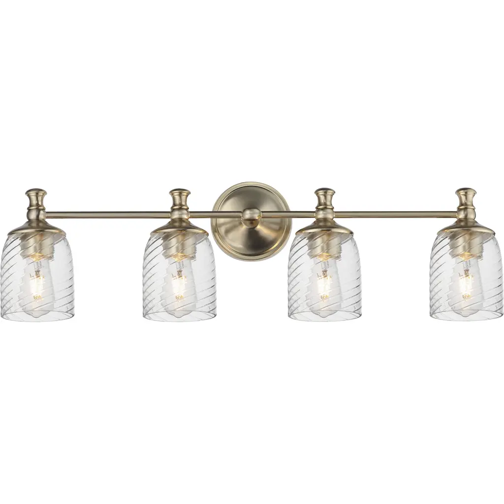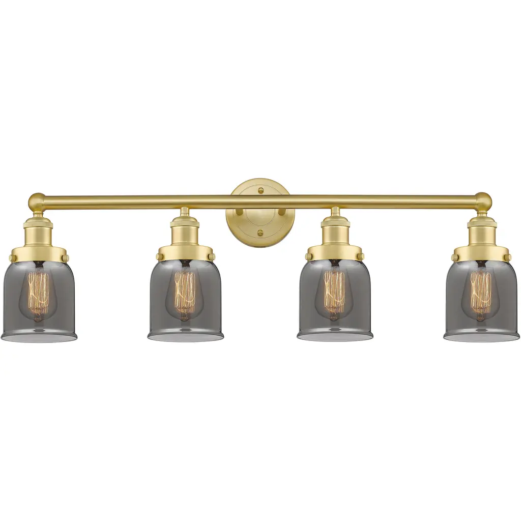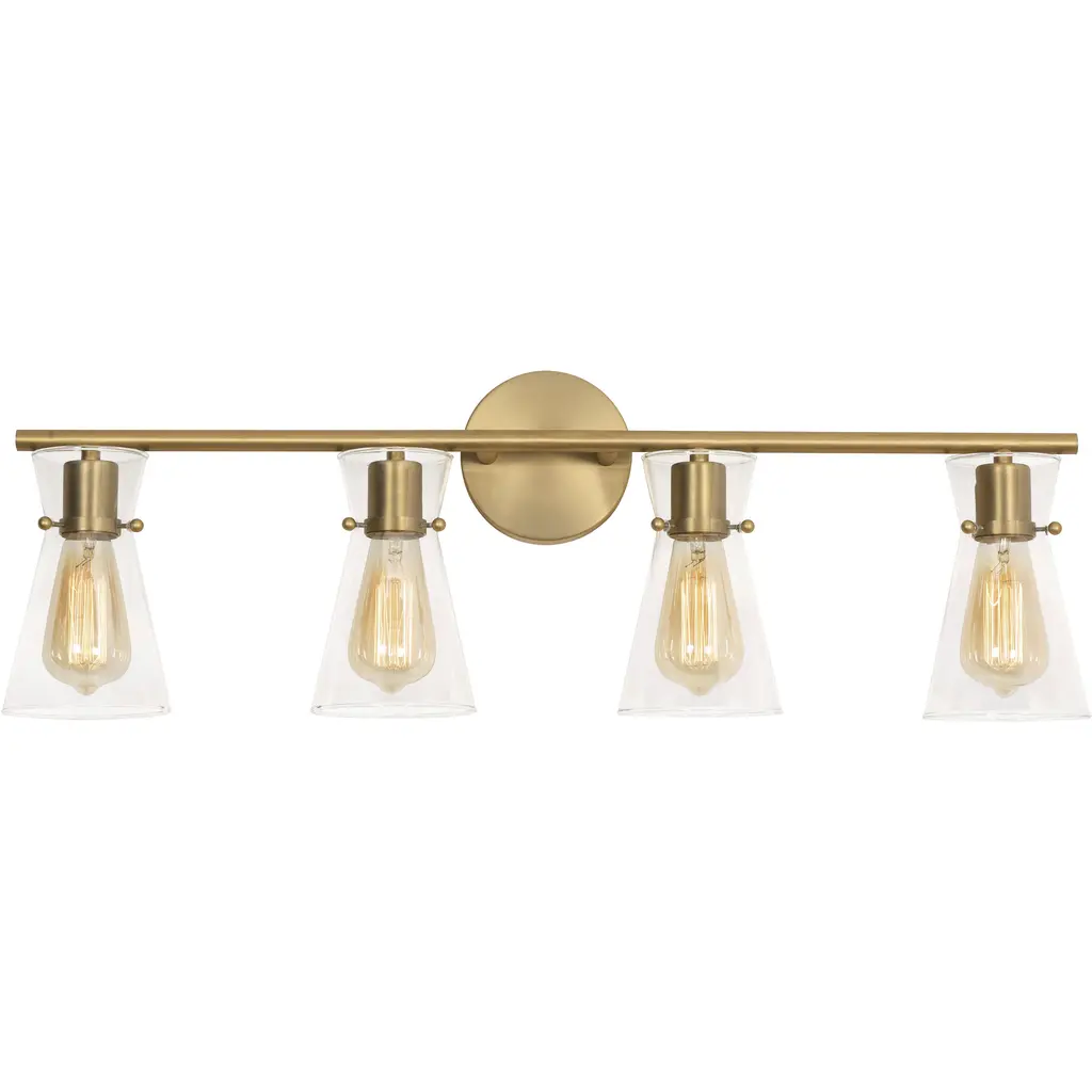 INNOVATIONS 616-4W-SG-G182 Canton 4 33 inch Bath Vanity Light Satin Gold. Style: Industrial, Farmhouse, Seaside, Nautical, Restoration-Vintage, Traditional. Collection Name: Edison. Metal Finish(Body): Satin Gold. Metal Finish(Canopy/Backplate): Satin Gold. Material: Steel, Cast Brass, Glass. Dimension(in): 12.375(H) x 33(W) x 7.5(Ext). Bulb: (4)60W Medium Base Incandescent(Not Included). Voltage: 120. Dimmable: Yes. Color Temperature (Kelvin): 2200. Color Rendering Index (CRI): 99.9. Lumens: 220. Life Expectancy (Hours): 2000. Glass Shade Description: Clear Canton. Glass Type: Transparent . Shade Shape: Bell/Urn. Glass or Metal Shade Color: Clear. Shade Material: Glass. Shade Dimension(in): 6(W) x 7.125(H). Fitter Measurement (Glass Or Metal Shade Fitter Size): 3.25 inch Fitter. Backplate Dimension(in): 4.5(W) x 0.75(Depth). ADA Compliant: No. California Proposition 65 Warning Required: Yes. UL/ETL Certification Type: Damp Location.