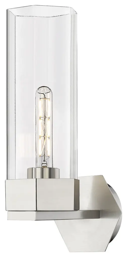 INNOVATIONS 427-1W-PN-G427-14CL Claverack 1 5.875 inch Sconce Polished Nickel. Style: Art Deco, Art Nouveau. Collection Name: Downtown Urban. Metal Finish(Body): Polished Nickel. Material: Steel, Cast Brass, Glass. Dimension(in): 16.625(H) x 5.875(W) x 7.5(Ext). Bulb: (1)5W LED(Included). Voltage: 120. Dimmable: Yes. Color Temperature (Kelvin): 2700. Color Rendering Index (CRI): 90. Lumens: 500. Life Expectancy (Hours): 15000. Glass Shade Description: Clear Claverack. Glass Type: Clear. Shade Shape: Geometric. Glass or Metal Shade Color: Clear. Shade Material: Glass. Shade Dimension(in): 4.75(W) x 13.25(H). ADA Compliant: No. California Proposition 65 Warning Required: Yes. UL/ETL Certification Type: Damp Location.
