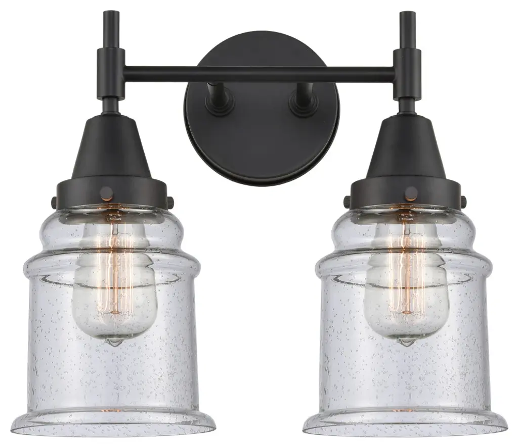 INNOVATIONS 616-2W-BK-G804 Clymer 2 12.875 inch Bath Vanity Light Matte Black. Style: Art Nouveau, Transitional, Modern . Collection Name: Edison. Metal Finish(Body): Matte Black. Metal Finish(Canopy/Backplate): Matte Black. Material: Steel, Cast Brass, Glass. Dimension(in): 11.125(H) x 12.875(W) x 6.4375(Ext). Bulb: (2)60W Medium Base Incandescent(Not Included). Voltage: 120. Dimmable: Yes. Color Temperature (Kelvin): 2200. Color Rendering Index (CRI): 99.9. Lumens: 220. Life Expectancy (Hours): 2000. Glass Shade Description: Seedy Clymer. Glass Type: Transparent. Shade Shape: Cylinder. Glass or Metal Shade Color: Seedy. Shade Material: Glass. Shade Dimension(in): 3.875(W) x 5.875(H). Fitter Measurement (Glass Or Metal Shade Fitter Size): Neckless with a 1.625 inch opening. Backplate Dimension(in): 4.5(W) x 0.75(Depth). ADA Compliant: No. California Proposition 65 Warning Required: Yes. UL/ETL Certification Type: Damp Location.