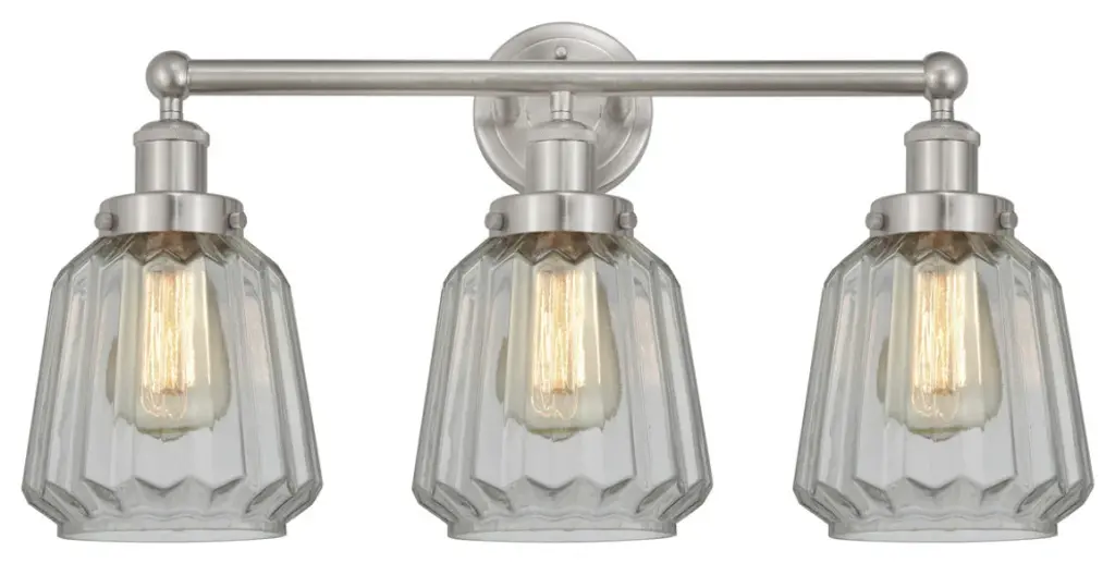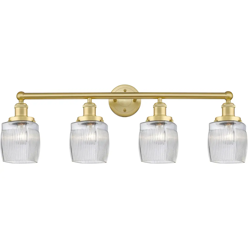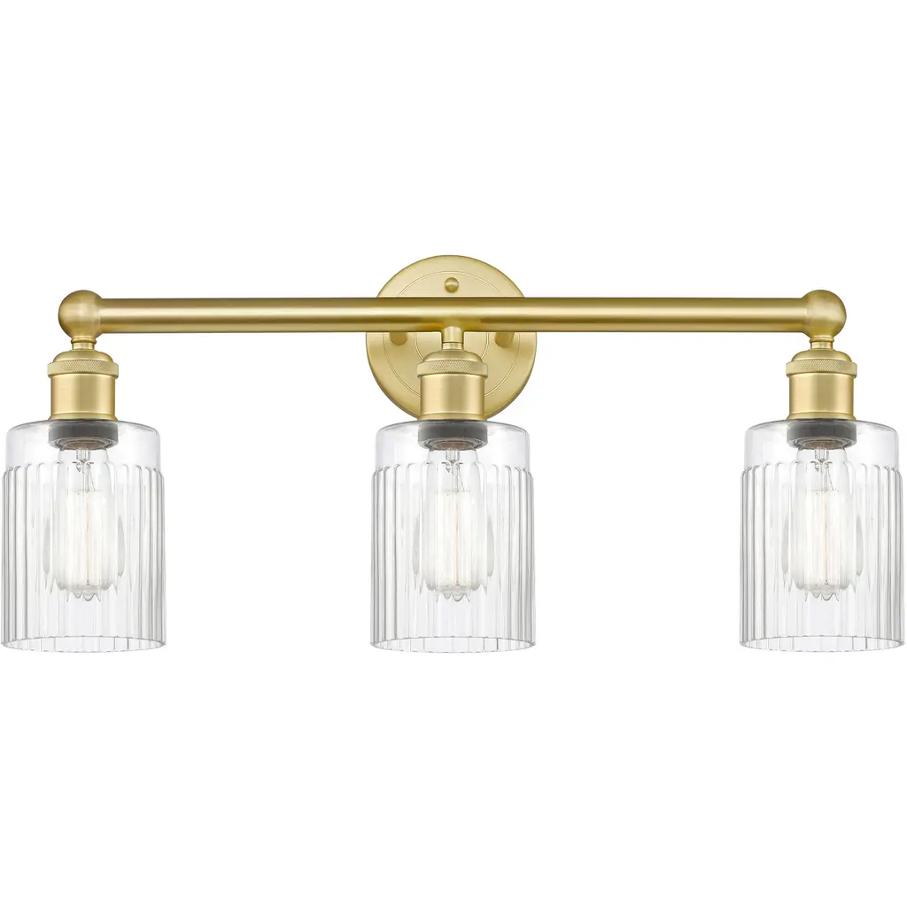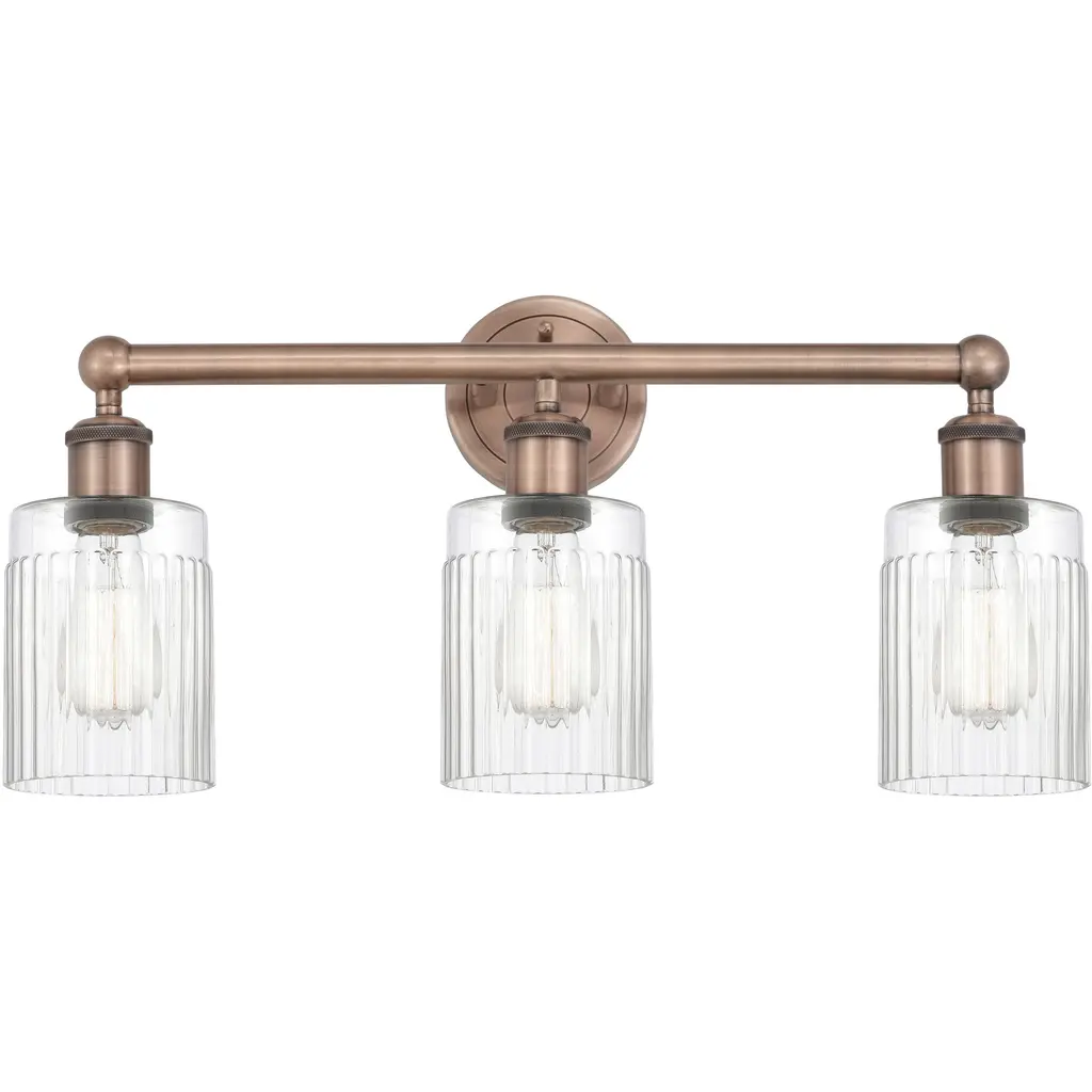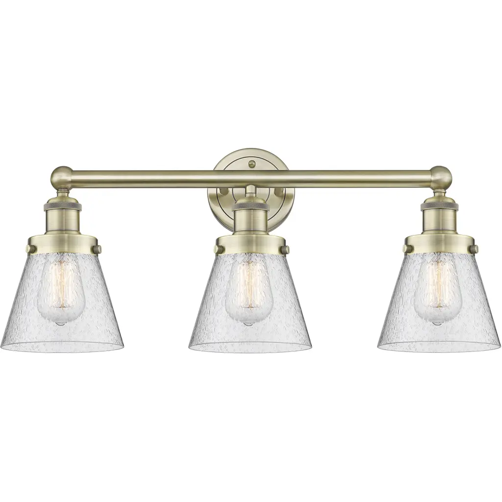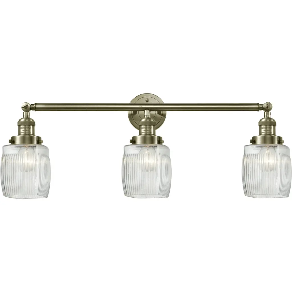 INNOVATIONS 616-3W-AB-G302 Colton 3 24 inch Bath Vanity Light Antique Brass. Style: Industrial, Modern Contempo, Restoration-Vintage, Transitional . Collection Name: Edison. Metal Finish(Body): Antique Brass. Metal Finish(Canopy/Backplate): Antique Brass. Material: Steel, Cast Brass, Glass. Dimension(in): 11.25(H) x 23.5(W) x 7.25(Ext). Bulb: (3)60W Medium Base Incandescent(Not Included). Voltage: 120. Dimmable: Yes. Color Temperature (Kelvin): 2200. Color Rendering Index (CRI): 99.9. Lumens: 220. Life Expectancy (Hours): 2000. Glass Shade Description: Thick Clear Halophane Colton. Glass Type: Transparent; Ribbed. Shade Shape: Square/Rectangle. Glass or Metal Shade Color: Clear Halophane. Shade Material: Glass. Shade Dimension(in): 5.5(W) x 6(H). Fitter Measurement (Glass Or Metal Shade Fitter Size): 3.25 inch Fitter. Backplate Dimension(in): 4.5(W) x 0.75(Depth). ADA Compliant: No. California Proposition 65 Warning Required: Yes. UL/ETL Certification Type: Damp Location.