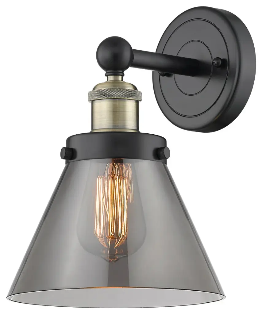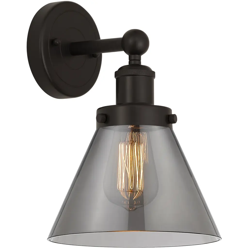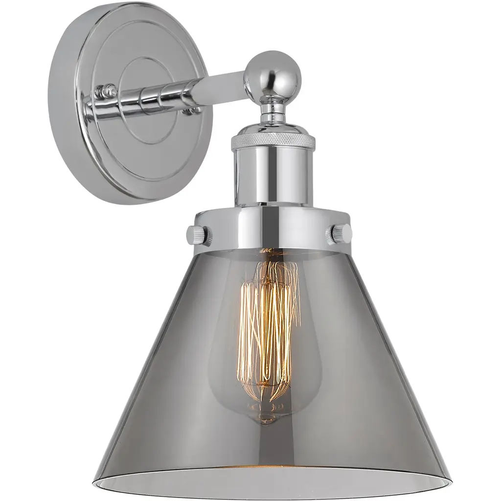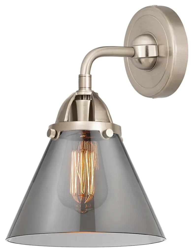 INNOVATIONS 616-1W-SN-G43 Cone 1 Light 6.5 inch Sconce Brushed Satin Nickel. Style: Art Nouveau, Industrial, Restoration-Vintage, Transitional . Collection Name: Edison. Metal Finish(Body): Brushed Satin Nickel. Metal Finish(Canopy/Backplate): Brushed Satin Nickel. Material: Steel, Cast Brass, Glass. Dimension(in): 11.25(H) x 7.75(W) x 8.375(Ext). Bulb: (1)60W Medium Base Incandescent(Not Included). Voltage: 120. Dimmable: Yes. Color Temperature (Kelvin): 2200. Color Rendering Index (CRI): 99.9. Lumens: 220. Life Expectancy (Hours): 2000. Glass Shade Description: Plated Smoke Large Cone. Glass Type: Colorful . Shade Shape: Cone. Glass or Metal Shade Color: Plated Smoke. Shade Material: Glass. Shade Dimension(in): 7.75(W) x 6(H). Fitter Measurement (Glass Or Metal Shade Fitter Size): 3.25 inch Fitter. Backplate Dimension(in): 4.5(W) x 0.75(Depth). ADA Compliant: No. California Proposition 65 Warning Required: Yes. UL/ETL Certification Type: Damp Location.