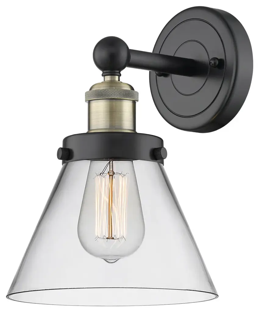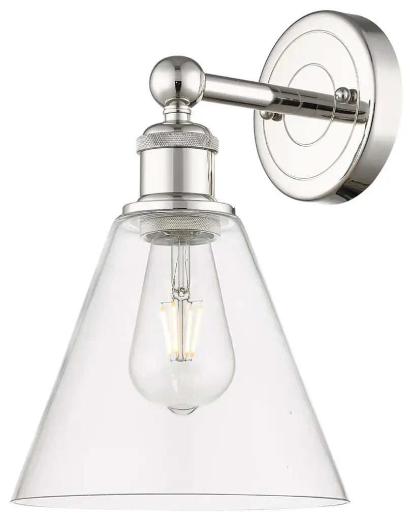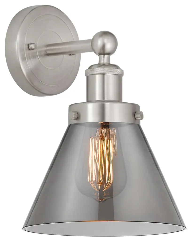 INNOVATIONS 616-1W-SN-G42 Cone 1 Light 7.75 inch Sconce Brushed Satin Nickel. Style: Art Nouveau, Industrial, Restoration-Vintage, Transitional . Collection Name: Edison. Metal Finish(Body): Brushed Satin Nickel. Metal Finish(Canopy/Backplate): Brushed Satin Nickel. Material: Steel, Cast Brass, Glass. Dimension(in): 11.25(H) x 7.75(W) x 8.375(Ext). Bulb: (1)60W Medium Base Incandescent(Not Included). Voltage: 120. Dimmable: Yes. Color Temperature (Kelvin): 2200. Color Rendering Index (CRI): 99.9. Lumens: 220. Life Expectancy (Hours): 2000. Glass Shade Description: Clear Large Cone. Glass Type: Transparent . Shade Shape: Cone. Glass or Metal Shade Color: Clear. Shade Material: Glass. Shade Dimension(in): 7.75(W) x 6(H). Fitter Measurement (Glass Or Metal Shade Fitter Size): 3.25 inch Fitter. Backplate Dimension(in): 4.5(W) x 0.75(Depth). ADA Compliant: No. California Proposition 65 Warning Required: Yes. UL/ETL Certification Type: Damp Location.