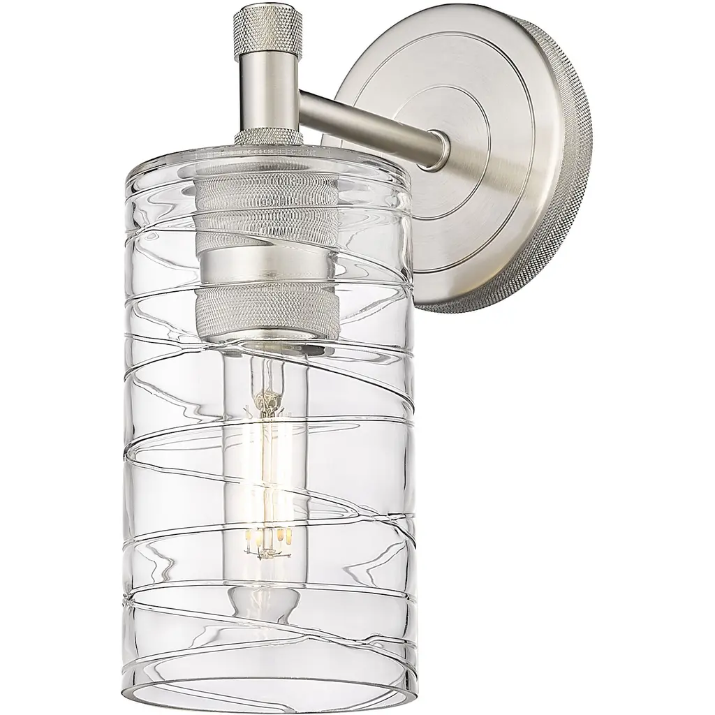 INNOVATIONS 434-1W-BB-G434-7DE Crown Point 1 4.5 inch Sconce Brushed Brass. Style: Industrial, Modern Contempo, Restoration-Vintage. Collection Name: Downtown Urban. Metal Finish(Body): Brushed Brass. Material: Steel, Cast Brass, Glass. Dimension(in): 10.5(H) x 4.5(W) x 6.5(Ext). Bulb: (1)6W LED(Included). Voltage: 120. Dimmable: Yes. Color Temperature (Kelvin): 2700. Color Rendering Index (CRI): 90. Lumens: 750. Life Expectancy (Hours): 15000. Glass Shade Description: Deco Swirl Crown Point. Glass Type: Transparent. Shade Shape: Cylinder. Glass or Metal Shade Color: Deco Swirl. Shade Material: Glass. Shade Dimension(in): 3.875(W) x 7.125(H). ADA Compliant: No. California Proposition 65 Warning Required: Yes. UL/ETL Certification Type: Damp Location.